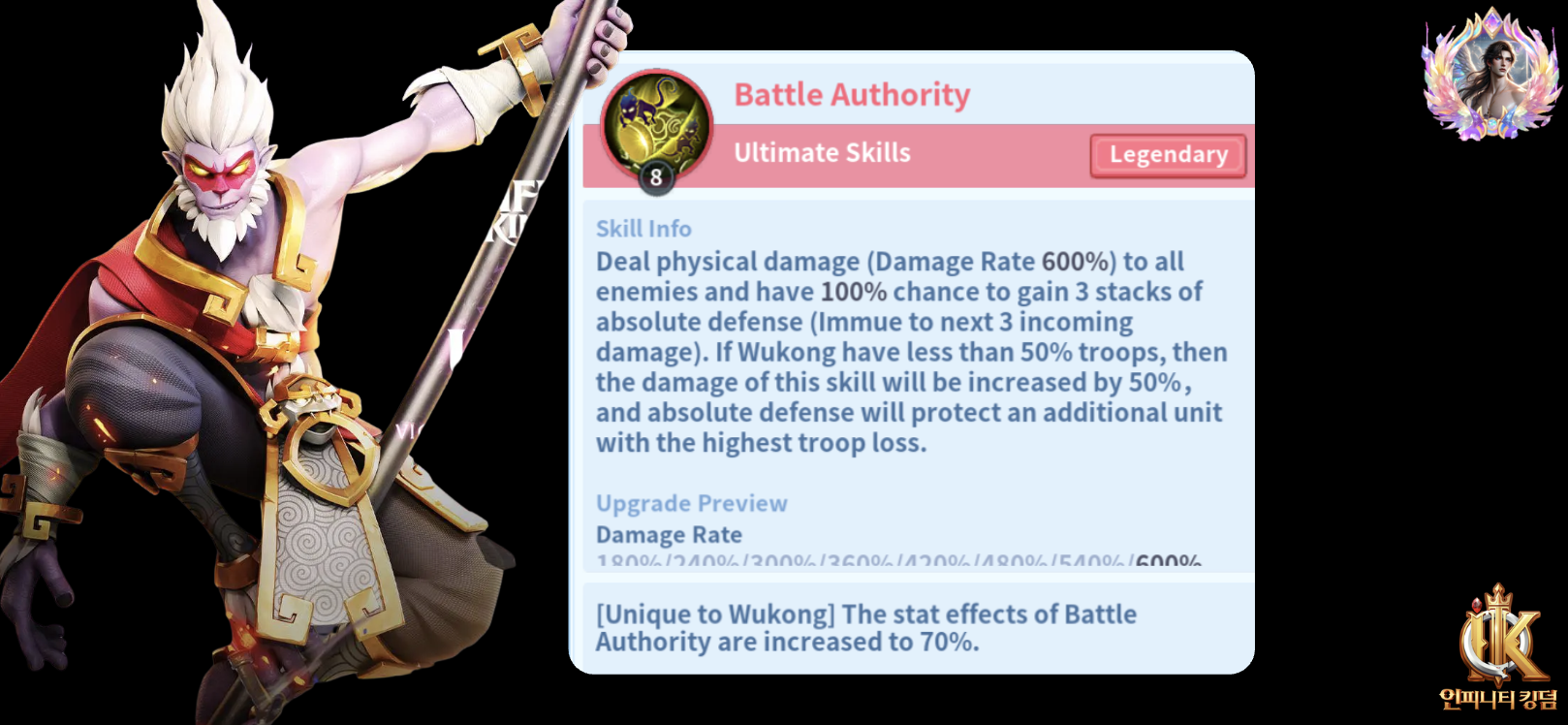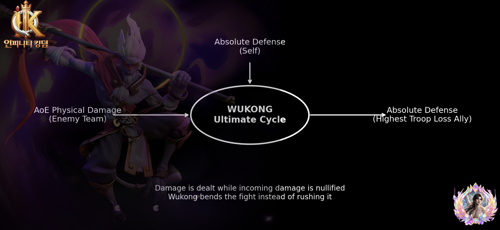 If Wukong’s troop count drops below a threshold, his Ultimate gains two additional effects: