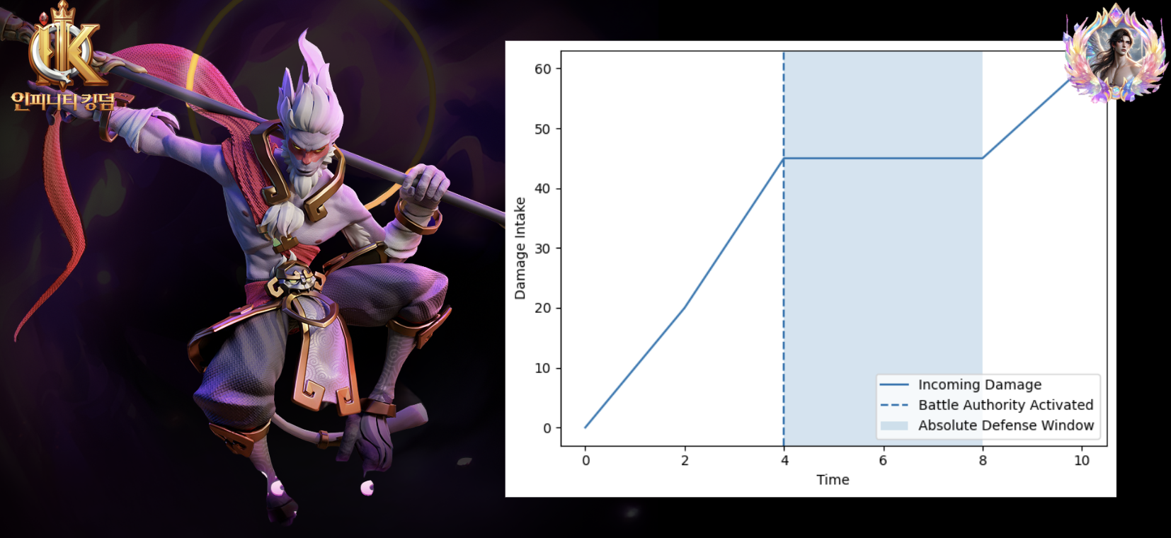 When activated, Wukong deals physical damage to all enemy troops, then grants himself three stacks of Absolute Defense. During this window, incoming damage is heavily reduced to the point where pressure simply stops converting into losses.