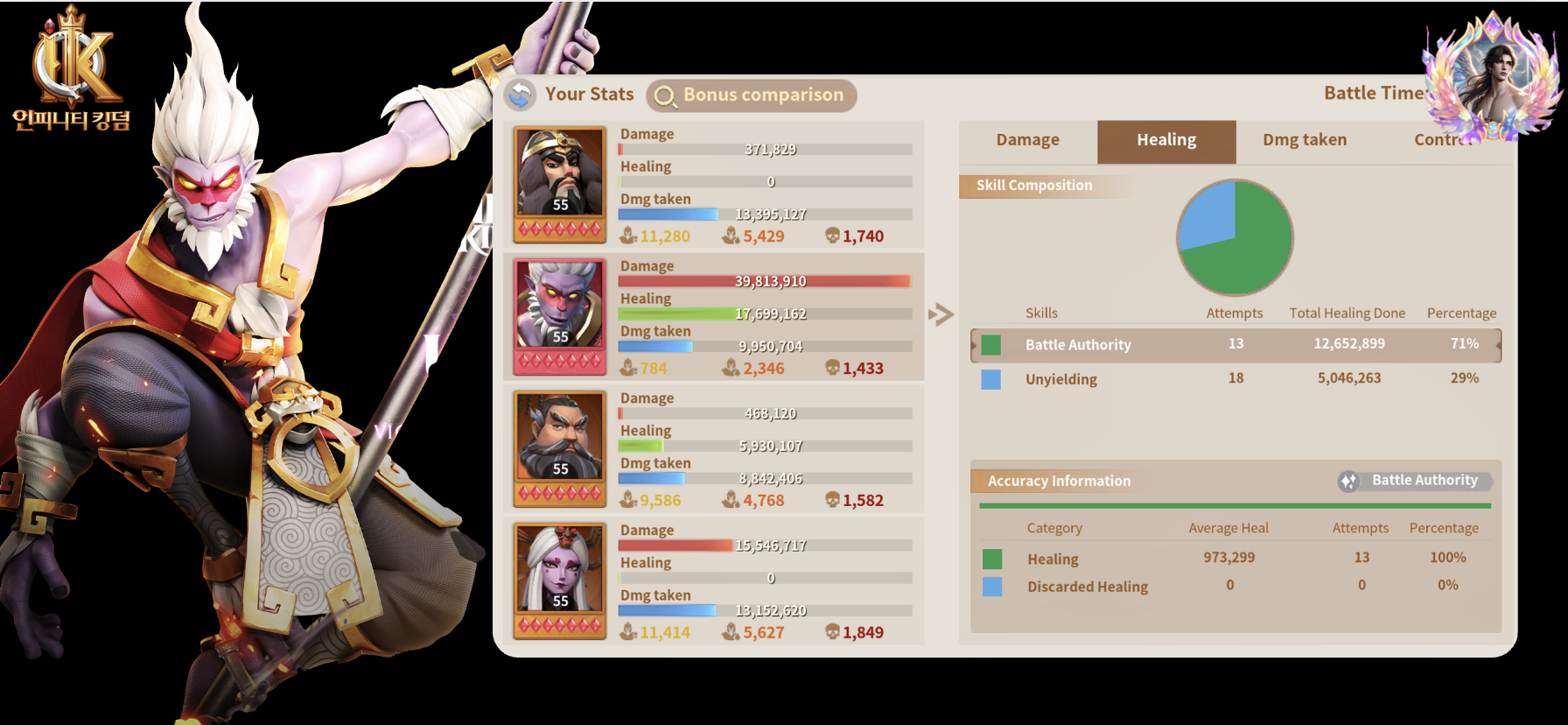 Wukong is one of the oldest Chaos Immortals in Infinity Kingdom, and also one of the most atypical. His design revolves around a simple but rare concept: dealing damage to the entire enemy team while denying retaliation at critical moments.