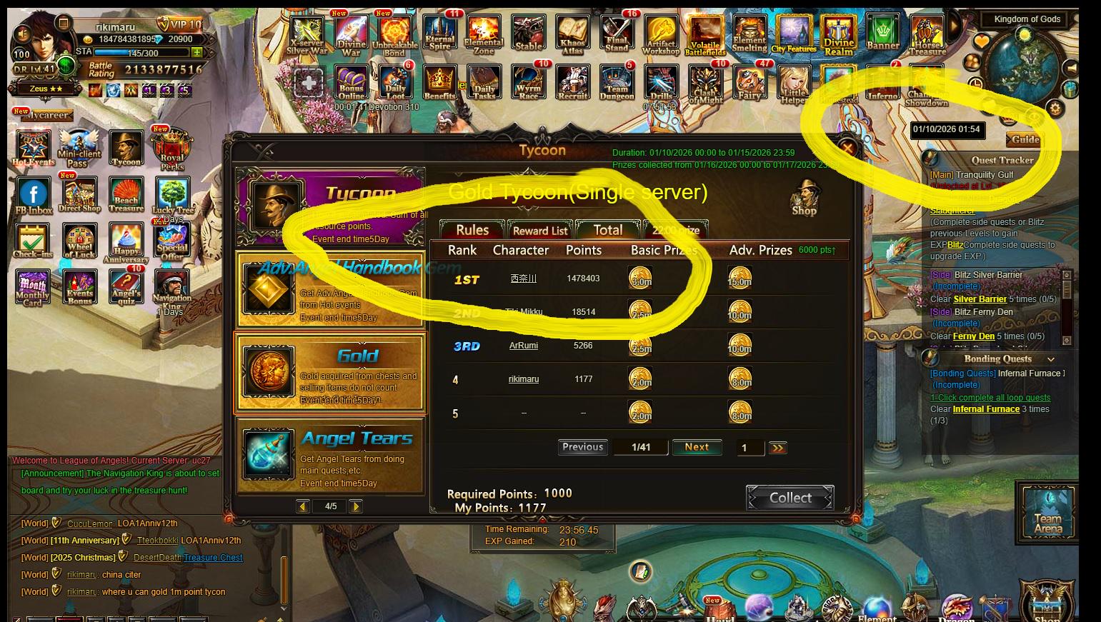 where he can get 1 million gold points less than 1 hour after tycoon