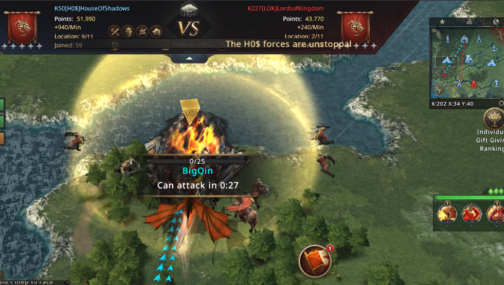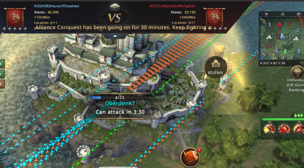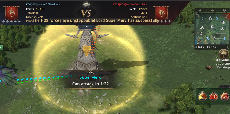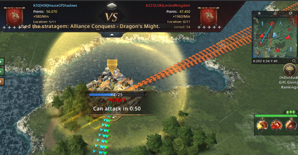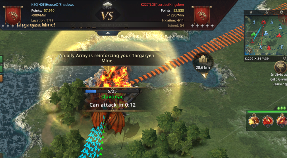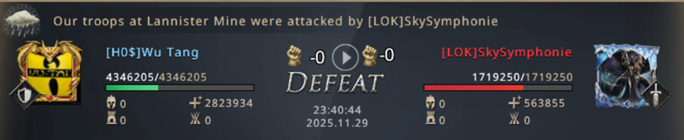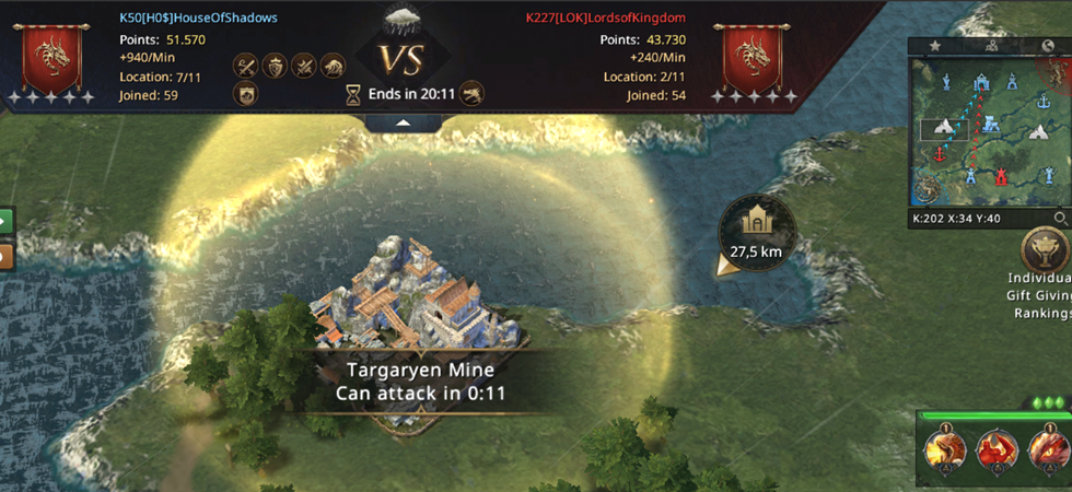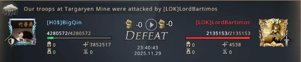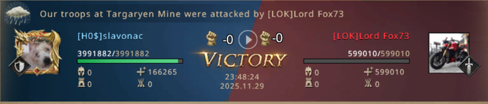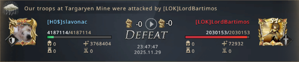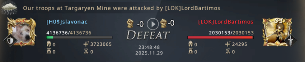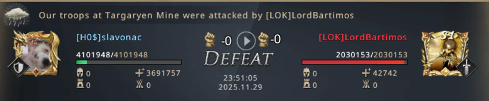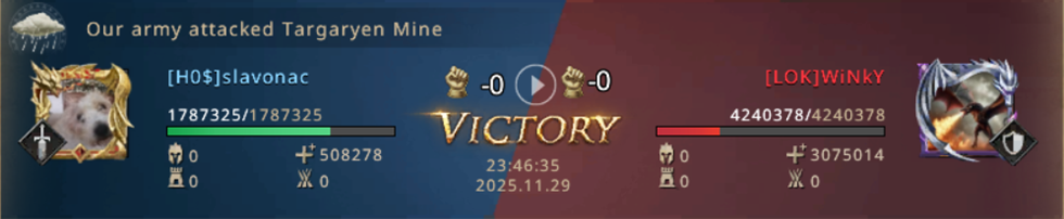I can't believe we managed to lose both Mines! From already winning the match, we now have to fight for our lives! Not only did we lose both Mines, but we also started losing the other Castles, which were now left poorly protected since we were completely focused on fighting for the Mines! Our 8k point advantage is melting away more and more with every second, if we don't do anything in just a few minutes, LOK will completely turn the match in their favor and defeat us! We went on the attack! WiNkY, their player who took the Targaryen Mine, is not that strong and we went on the attack on him!