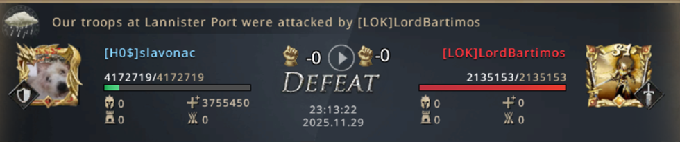 Just as I expected - the attacks on the Lannister Port which was under my control began, and each of their attacks became more and more difficult to survive... We especially had a hard time surviving the attacks from their strongest player, LordBartimos. Somehow we managed to maintain our defense, new troops were constantly coming to defend us, however, when they simultaneously started attacking some other Castles, that thinned out and finally, after a dozen attacks that we endured, we finally had to sign the capitulation and hand over Lannister Port to them...
