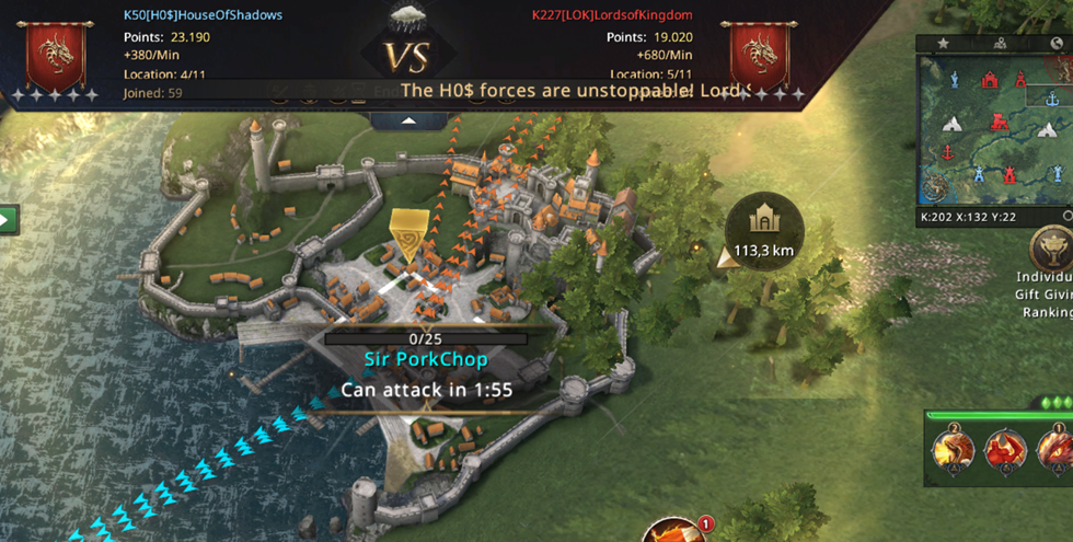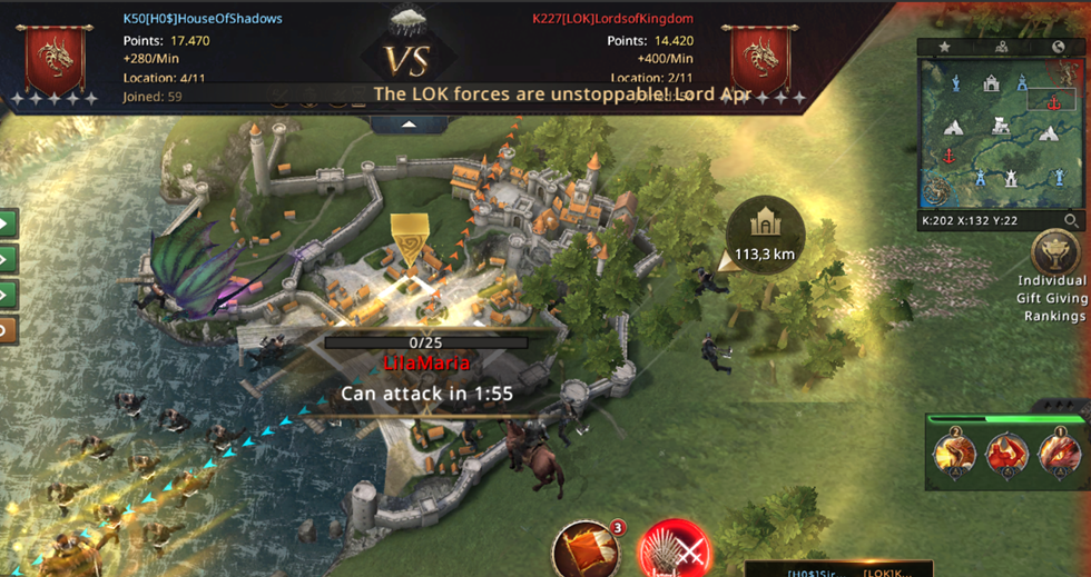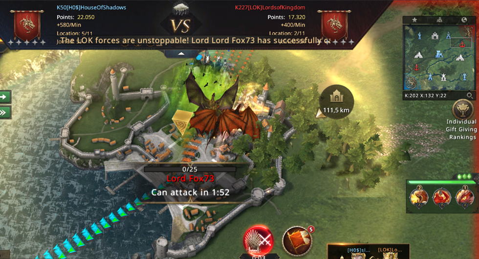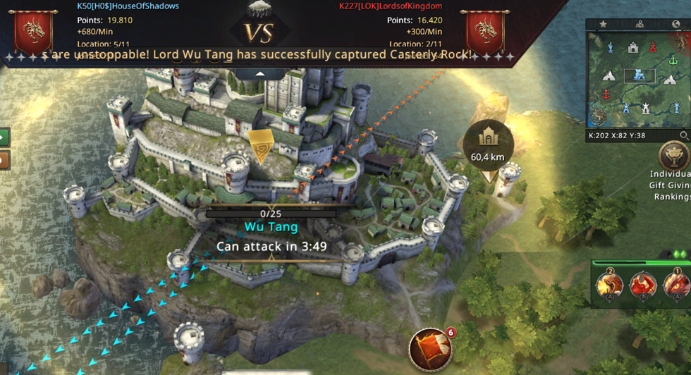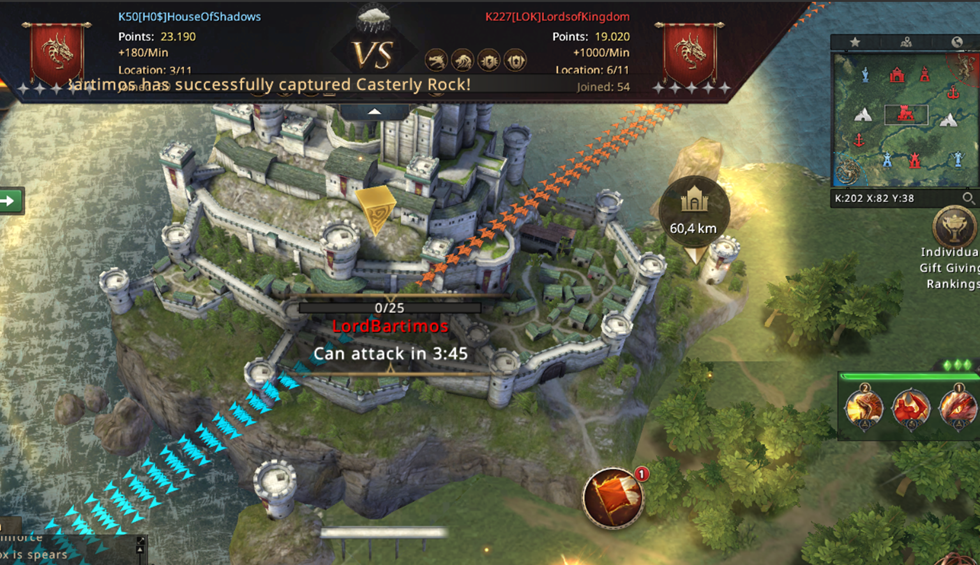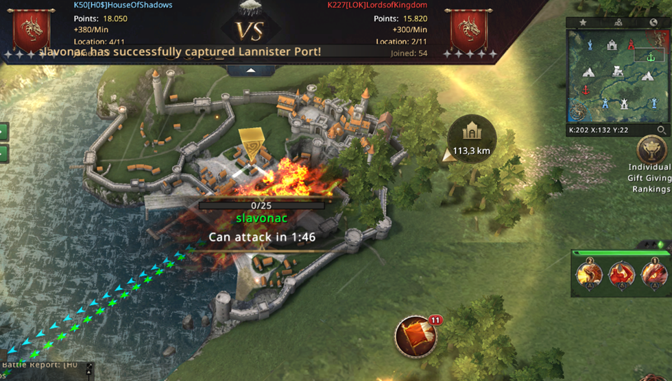 Unfortunately, we didn't have much of a chance to defend ourselves since almost all of our players were busy attacking Lannister Port, so we lost CR and got into big trouble... At that moment, we only had three Castles in our possession while LOK was gaining a whopping 1000 points per minute! Luckily, almost at the same moment we lost CR, our troops reached Lannister Port and we managed to take it back!