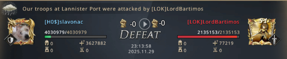 Once again the match completely changed direction and suddenly they were the ones getting more points than us! Again we had to do something! Luckily, our strongest players were free to attack, and we decided to attack Lannister Port! Taking just one Port would have meant a lot to us again, but the most important thing is the points - again we would be the ones getting a lot more points! We decided to start with several simultaneous rallies, while Oberdon would try solo attacks. Since there were infantry in the defense of that Castle, I could not participate in the attacks, but I had more important things to do - while we were preparing to attack Lannister Port, LOK launched large attacks on CR, which needed defense!