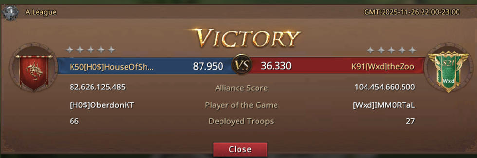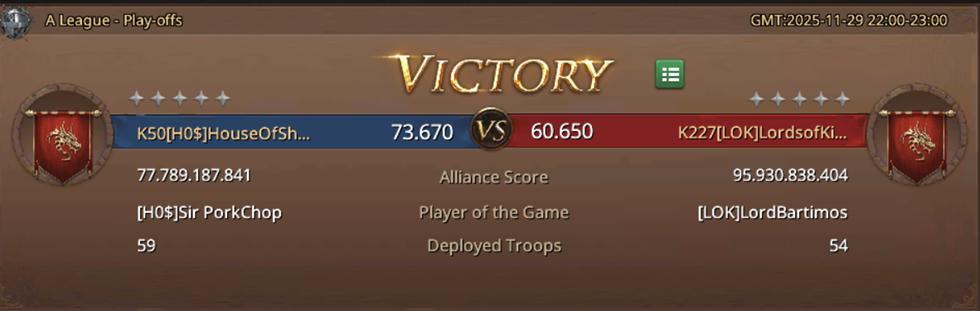 We knew from the beginning that this would be an extremely difficult match, we knew that LOK is a really strong alliance that had the misfortune of meeting ARP right in the first round, which cost them a relegation to the bottom of the draw, and now their season is over, much earlier than they had hoped. I can't say about their other matches, but they really showed themselves in a very nice light against us, they played a great match, without mistakes, they played until the very end! It's a shame that they ended their journey so early in this season, but I congratulate them on everything they have played so far! We, on the other hand, played a truly fantastic match! Despite the fact that we entered this match weakened, with a smaller number of players than usual, like LOK, we did not make a single major mistake, we played the entire match at a really high level and deservedly came to victory! It would not have been undeserved if LOK had won, but since one alliance had to win - I'm glad it was us! And I'm glad that I finally showed that I deserve to be part of this alliance - in the key moments of the match I managed to take Targaryen Mine and defend it, which ultimately brought us victory! And now we are waiting for the continuation of the season, that is, in the next match we will face the losers from the match ARP and MAi, that is, the first and second alliances in the regular season, so a real spectacle awaits us in the next match!