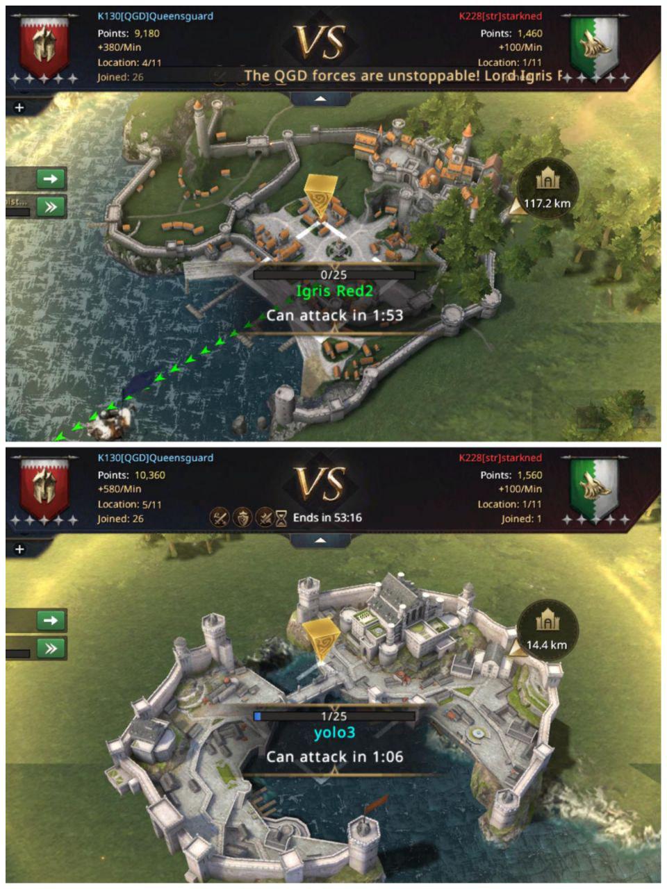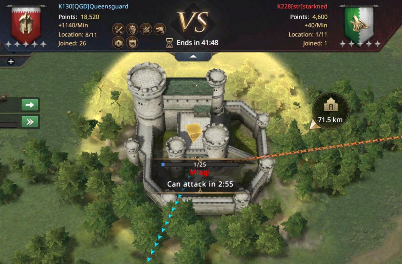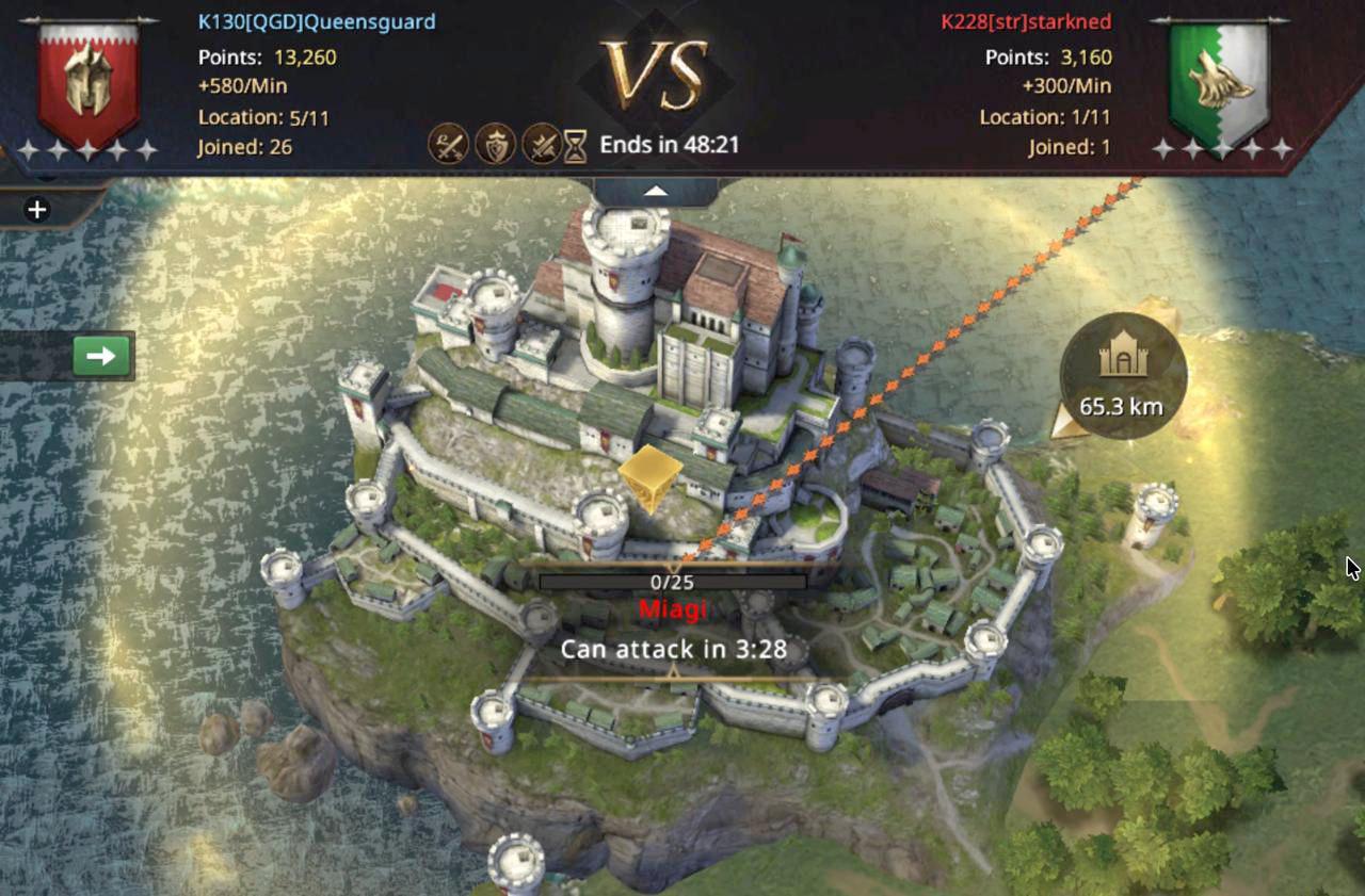 The first regiment sent by his stronghold sent off LordLionel from Castelry Rock. The next second, ShmooVe took it back and ensured it stayed in QGD’s hands. Within the same timeframe, LordLionel took that opportunity to take the Lannister stronghold Miagi had controlled. QGD wanted to let him get some points sure but not at the cost of their own game.