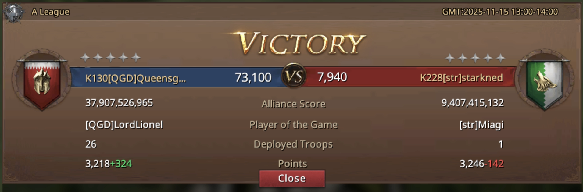 It is no trouble for LordLionel who, as soon as CR opens up, takes it back for QGD. She was on the side of letting Miagi take a building and build points but her primary goal stays to get full rewards and points for her alliance and as we can all see, she’s leading by example. At this point, it’s 15,500 points to 4,360 for str, quite a difference but QGD have to keep focus from now on or else they might slip away from complete control of the game.