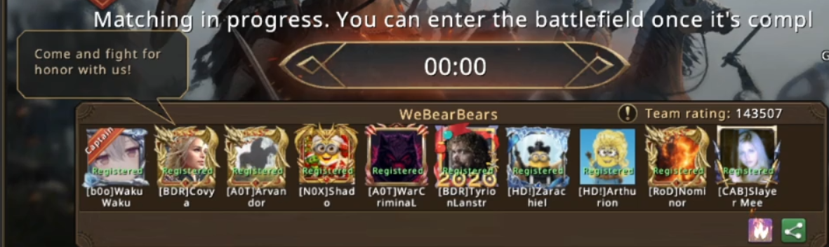 With Vorian joining his most trusted commanders and a few other upgrades including some new dragon skills to show on battlefield, he was now fully ready to take up the challenge and hopefully get one more win in the last round, despite having no chance to get to the glory king rank this season. As soon as he had everything done, Sunday after the sunset he left [N0X] castle and headed towards the Arena of Honor battlefield. Once he arrived there, he found his team waiting for him and noticed a few changes into the roster of the team as LadyArthena and MightyLemon couldn't participate to this round, so the team decided to register with just 8 people and hope the other 2 warriors joining from the mercenary camp will be on pair with them.