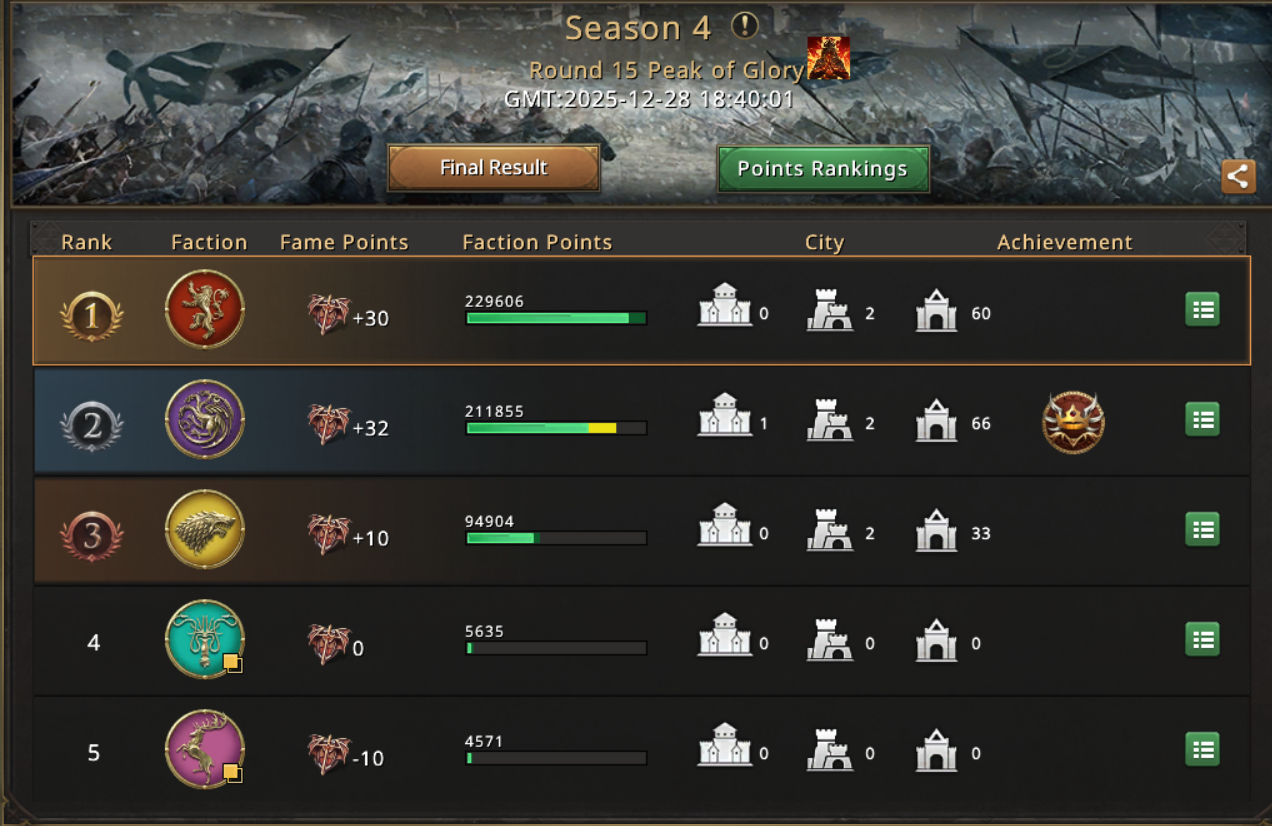 Once the city opened everyone rushed for it with quick solos and it changed hands a few times before the other members even had time to send reinforcements and then Josehf managed to stabilize the city for House Stark, and it was now time for the other houses to start rallying. Both House Lannister with Arthurion and Nominor and House Targaryen with Grombold and Makima started the rallies, and they got filled within seconds and in less than a minute they were at the vale entrance ready to change towards the City of Glory. The battle that followed was one of big proportions with soldiers falling on both sides very quickly just so others can take their place and fight on top of what was now a vale of bodies. Josehf managed to win against 3 of the 4 rallies but he didn't have enough forces to defeat the 4th, and the city swapped hands. The battle went that way for the most of its remaining time with houses managing to take the city but not being able to hold'it for the 4 minutes required to fully occupy 'it. However, with just a few minutes left to play from the round, the House Targaryen found a breaking point, managed to reinforce the city in time and despite the full opposition of the other 2 houses they secured the City of Glory.