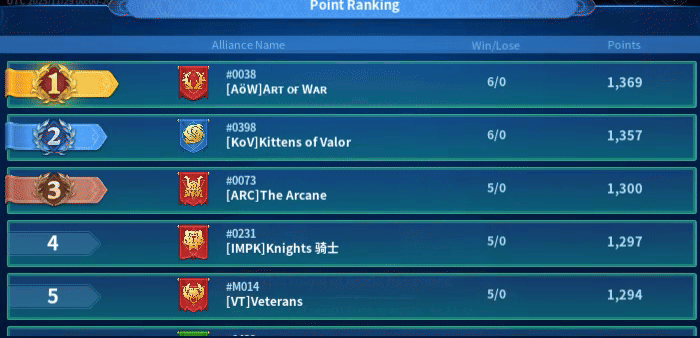 - Server 38’s AoW overtook ARC for first place with a 6-0 record.