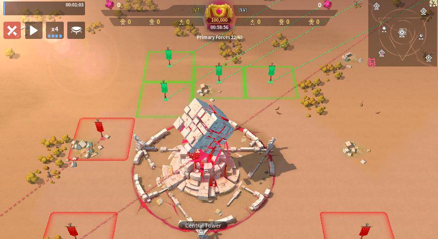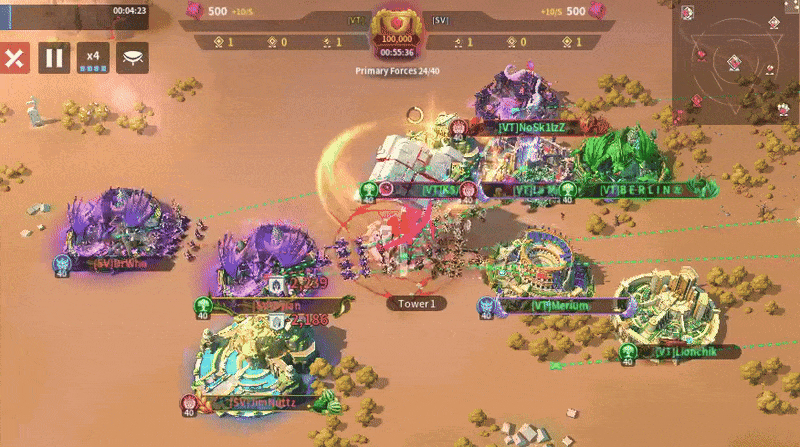 At the Central Tower, VT sent four players while SV committed six. One SV player positioned too close to VT and too far from his teammates, leaving him vulnerable. Because the Central Tower does not become capturable until ten minutes in, VT’s smaller initial presence was not decisive, and with effective stalling and timely reinforcements, they had a path to potentially turn the fight in their favor.
