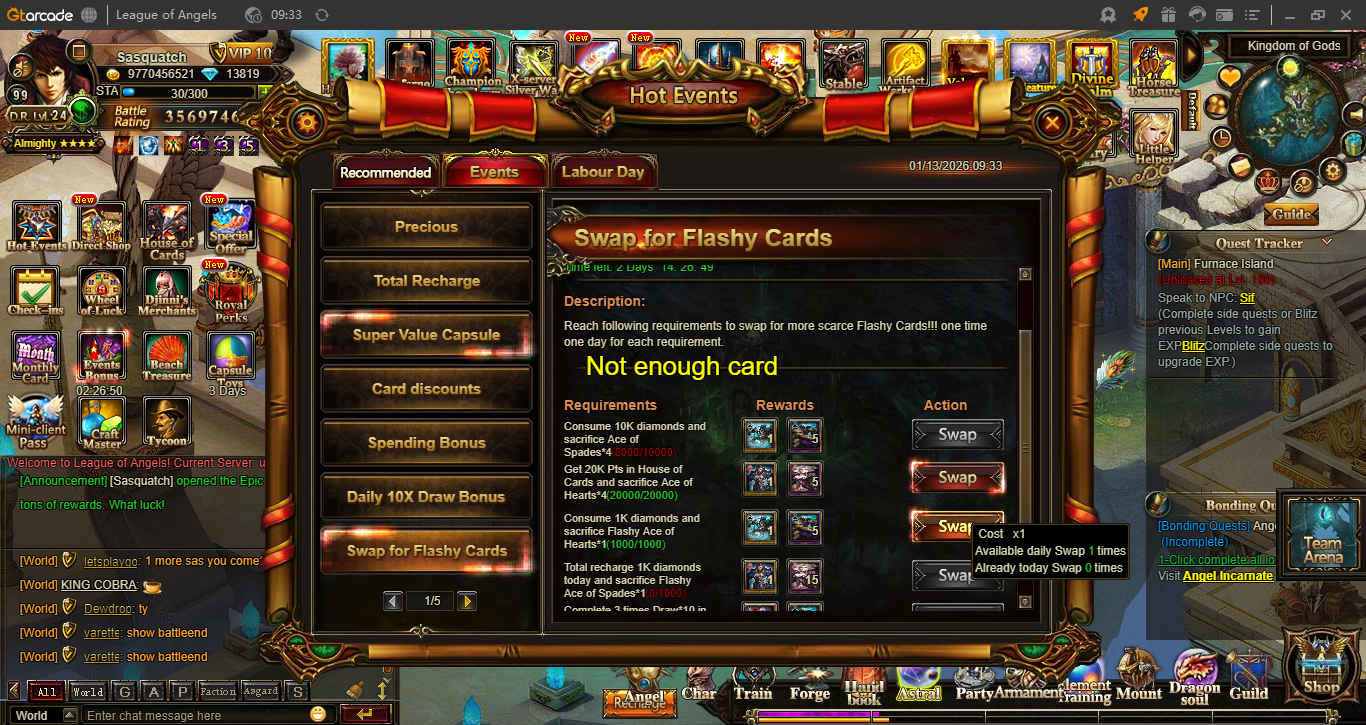 Today I consumed 8k diamonds and also I have 20k House of Card event points. I collected Flashy Ace of Hearts and in Hot Events (Swap for flashy cards) it open the option to swap Flashy Ace of Hearts for 1x Flashy Ace of Spades and 5x Flashy 7 of Spades.. but unfortunately it doesn't allow me to do this.. please fix it because I want to swap it.