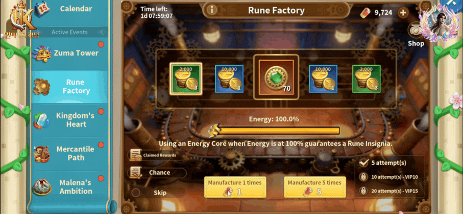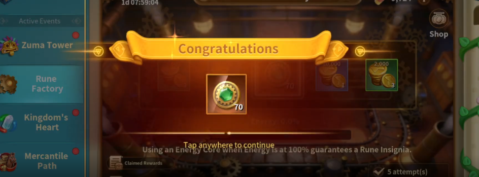 There is an early-drop mechanic, but it is deliberately rare (0.5% chance to get 70 Rune Insignia). Each activation has a very low chance to immediately grant a large batch of Rune Insignias. This means most players should expect to reach the full Energy threshold repeatedly rather than relying on luck.