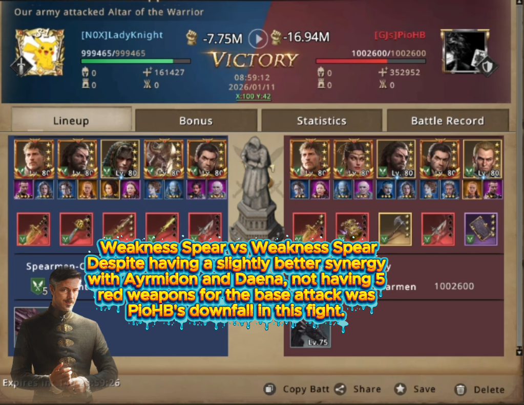 Ladyknight, as named commander by Cersei herself, decided to go with military camps for this fight, as after the changes made by the Old Gods and the introduction of the AI teams, getting a second Clan Castle is almost mandatory to have any chances at winning the round. Her effort paid off and within minutes from the start of the fight, they managed to occupy the House Baratheon's Clan Castle and start taking their strongholds too. With the strongholds constructed, it was now time for the team to start focusing on the altars that were about to open. Being once again on a stacked battlefield, LadyKnight did her best to reinforce the stronger warriors in her team but still looked all over the battlefield for possible targets she could solo out and it didn't take long for her to find one.