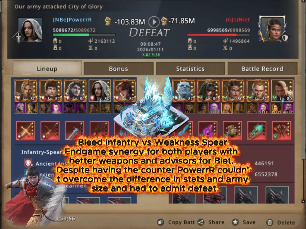 Cersei sent PowerrR while Sansa sent lelele and SaShiMi to deal with Biet and rallies were quickly started and filled by the other team members. In a matter of minutes, the rallies were already marching and soon they arrived on the city's gates, tens of millions of troops ready to clash with the defending forces inside the city. Despite being lower in numbers, the troops defending had the terrain advantage and as soon as the orders were given, a clash of epic proportions took place between the forces. Weapons started clashing and troops very falling on both sides at a rate that couldn't be sustained by the reinforcements sent.