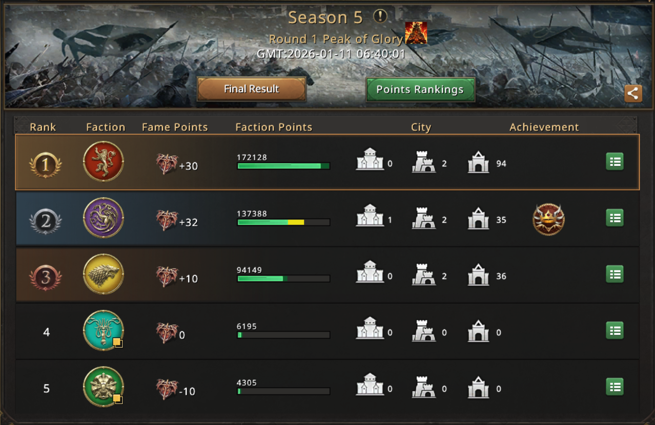 PowerrR's rally was the first once to hit and despite getting deflected, he managed to do quite a lot of damage on Biet's forces and allowed the other 2 rallies to kick the remaining forces in the city, and it was now up to Stark's to defend. As always Cersei wanted the city for herself and now launched rallies together with Daenerys in an attempt to secure the city. A back and forward battle started between the 3 houses with none of them managing to hold the city for the 4 minutes required to fully occupy 'it. Targaryen's however had the catapult advantage, and it was very easy for them to kick the other 2 houses while they were struggling to do the same. With the minutes passing and with so many troops needed to be healed, with 10 minutes left to fight, the rallies were filling a bit too slow and that allowed House Targaryen to quickly send new reinforcements between the rallies and ultimately that secured the City of Glory for them.