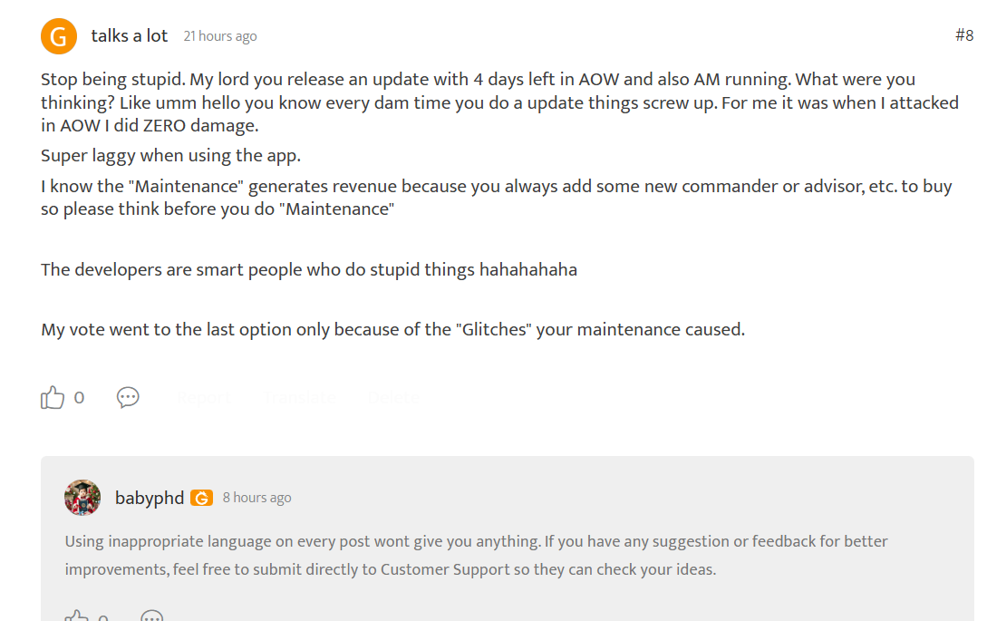 I Think you got upset due to my honesty about the last "Maintenance" that caused a lot of issues during a 14 day event that only occurs twice a year. Suck it up sunshine in my opinion you are only moderating this forum for FREE Black Diamonds that enable you to go to different servers to be a bully. I may be wrong about that but............pucker up if you must.