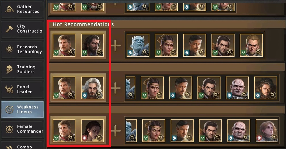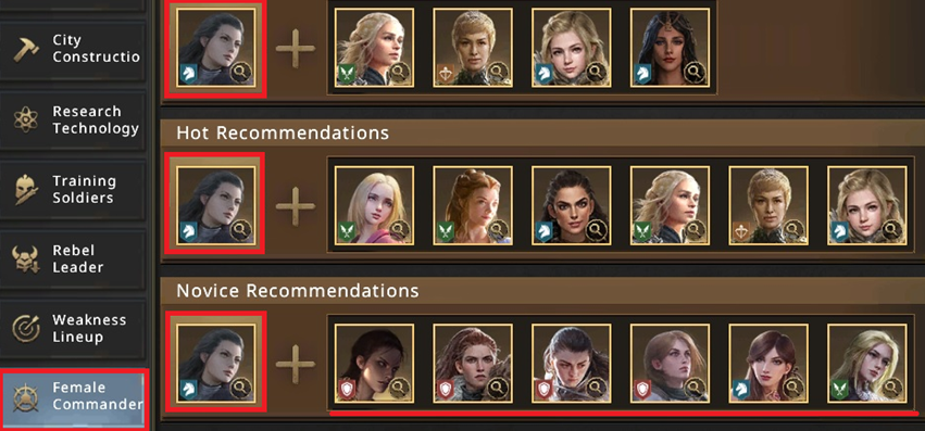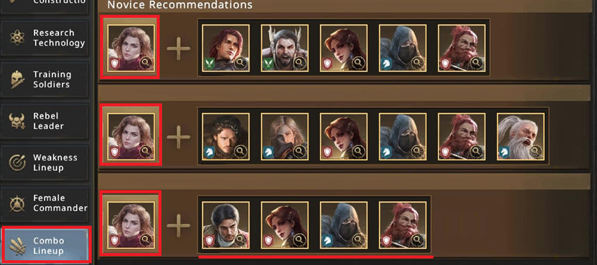 So, depending on your troop type your lineup will be different. The association of commanders shown here are for beginners, as you get new, stronger commanders it will change. Nonetheless, the whole point is to make your commanders work well together, so you have to take into account their abilities and specialties to make the best use of them.