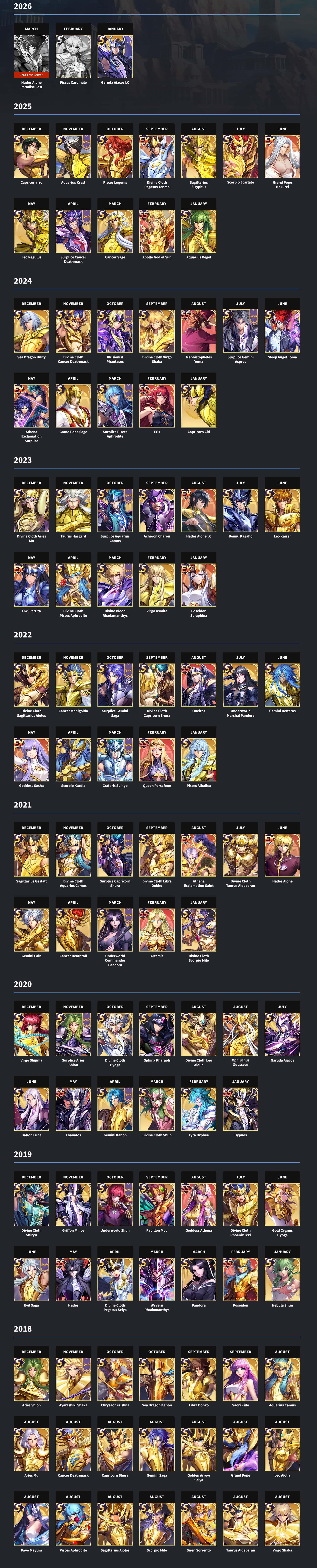 I found this calendar online of the SSA-Kotz Banner Saint launches (month/year). It's helpful because it lets everyone know which Rebirthed Armor launch is upcoming, which saint banner comes next so as to be able to farm/save/manage the game better.