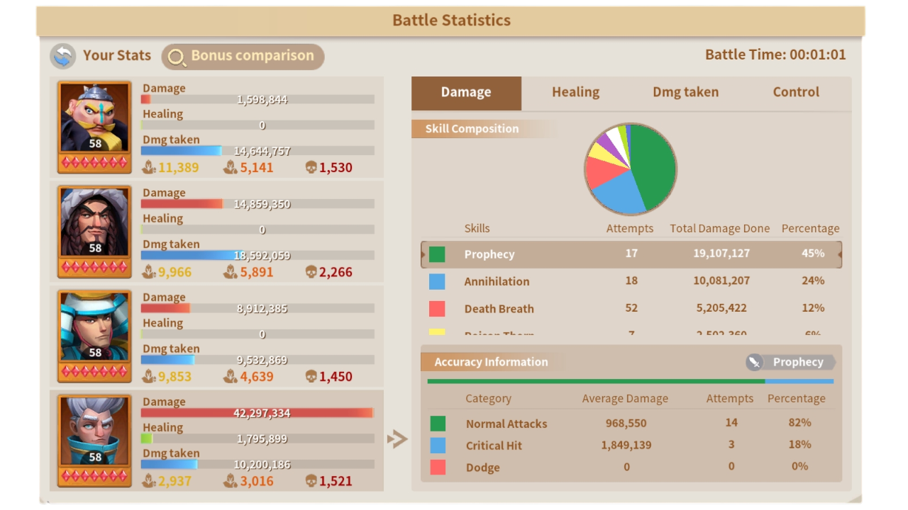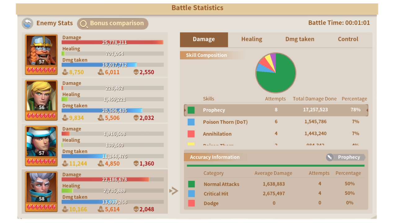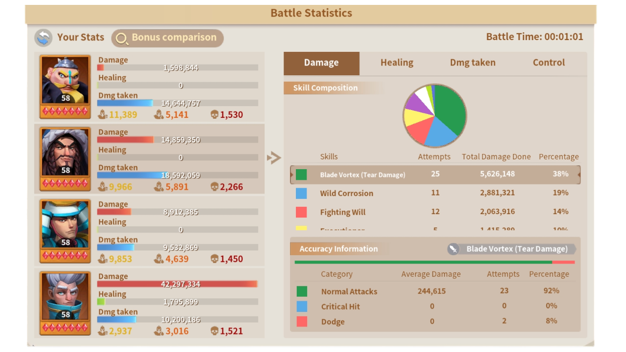 The offensive frontline applied constant pressure. Attila’s Blade Vortex contributed a large share of his damage through repeated Tear effects, while Wild Corrosion and Fighting Will triggered often enough to keep damage rolling. This meant the defensive frontline was under steady pressure and never had time to stabilize. Ragnar added to this by landing silence and stuns with No Escape and lowering enemy damage early, which delayed defensive ultimates and healing.