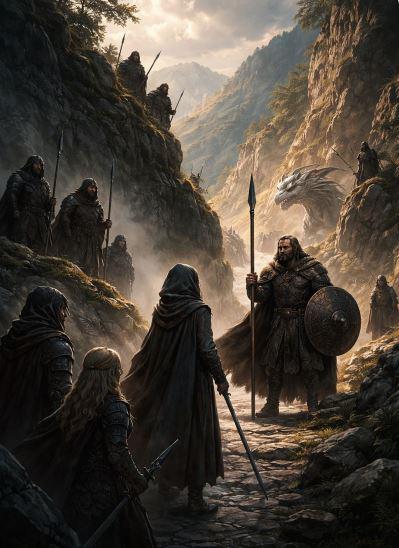 Desde lo alto surgieron figuras humanas, envueltas en capas oscuras, armadas con lanzas y escudos marcados por símbolos antiguos. No eran soldados regulares, sino guardianes del paso, endurecidos por el viento y el tiempo.