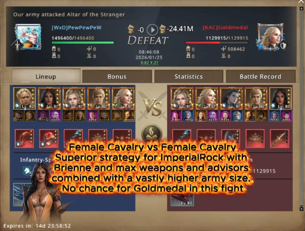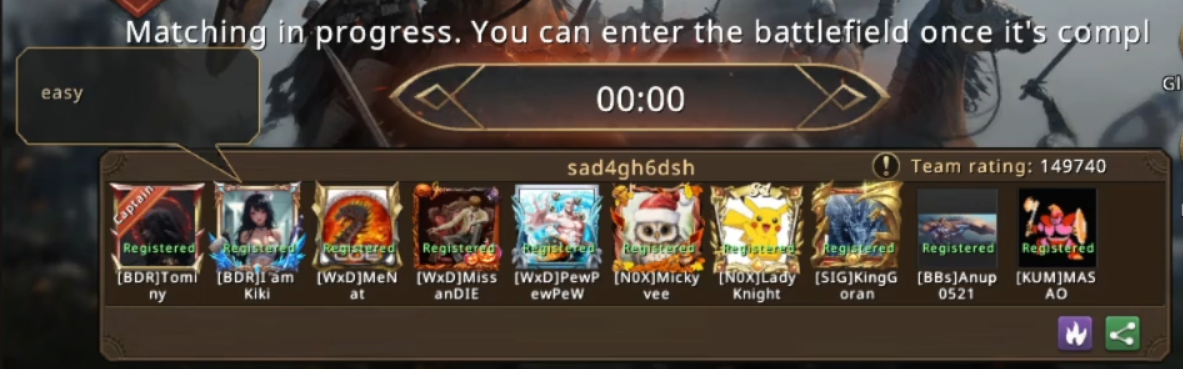 As Westeros is approaching the end of January, for the warriors of Westeros there's another round of Arena of Honor Season 5 coming. After having to go solo on the first round, [N0X]LadyKnight joined back on the Fantastic 10 team and in the 2 weeks between the rounds she managed to get a few new weapons for her commanders and adapted her strategy back for playing in a team. The 2 weeks flew by quickly and on Sunday morning before the sun raised, she was ready to go back to the Arena of Honor battlefield. Once she arrived there, she noticed that the Fantastic 10 team was now Fantastic 8 as 2 of the members left and they weren't replaced in time. With all the 8 members ready, the team got registered by Tominy and everyone waited for the matchmaking to be done by the old gods.