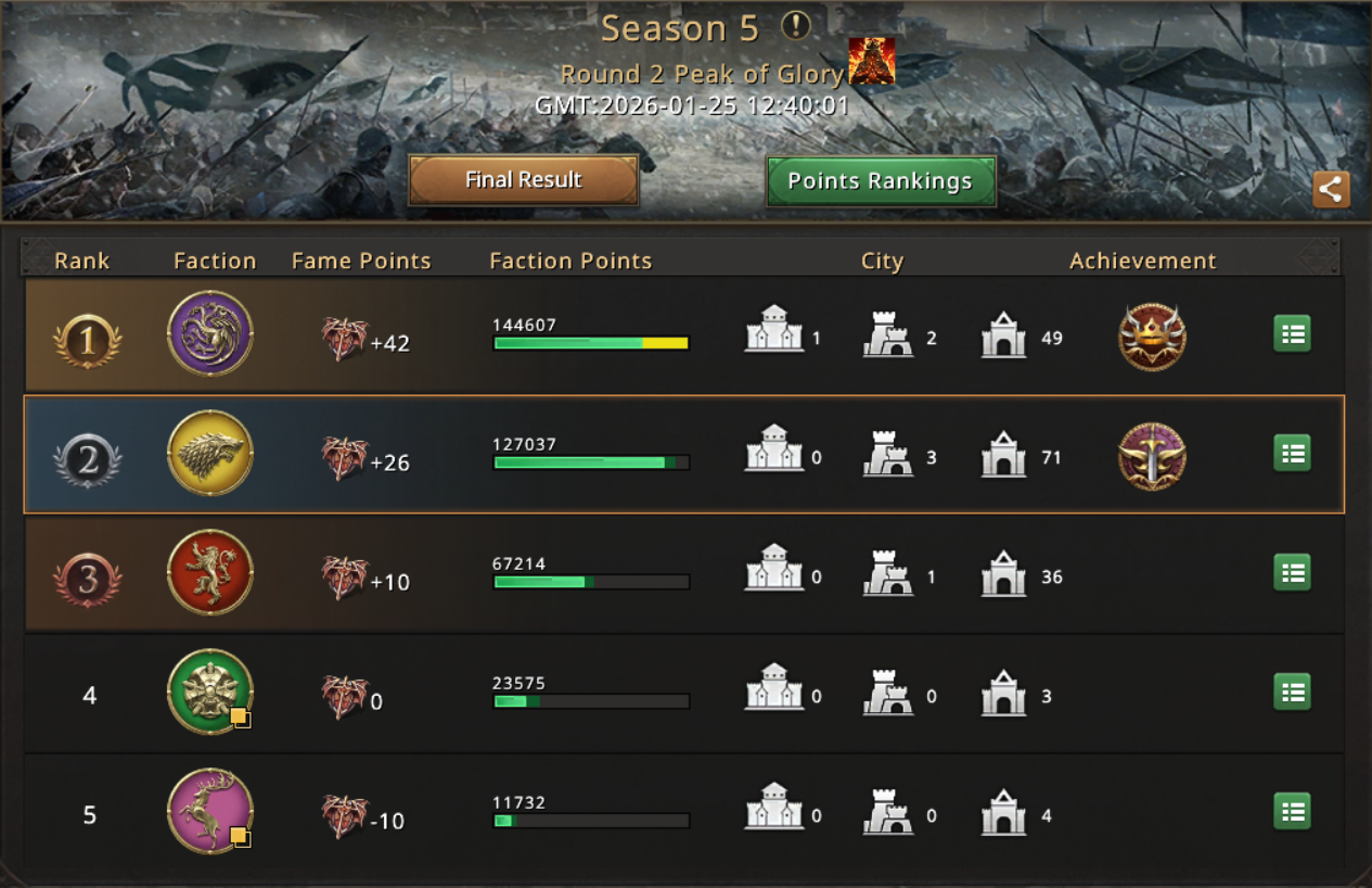 That offered them a boost in the fame points at the end of the battle and they almost managed to defeat the Targaryen's in points despite them having the City of Glory.