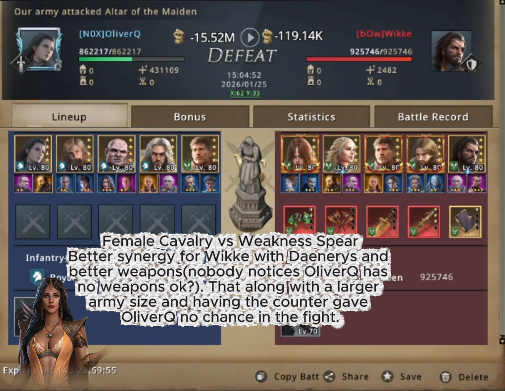 While Westeros is slowly preparing to leave winter behind, [N0X] OliverQ is preparing for a 2nd round of his favorite event, Arena of Honor. After a disastrous round 1, where he and his team barely managed to beat the AI NPCs and get a 3rd place, he's determined to do better this time and hopefully get a first place to get back on track. While his researchers are still away of discovering the valyrian steel weapons, he managed to upgrade his commander weapons and even went on a quest to get another dragon skill for his main dragon. That took him almost 2 weeks and in before he knew, it was already Sunday and the time for him to go to head towards mercenary camp once again. As soon as he arrived there, he headed directly to the registration office and signed the papers required to participate in the round and then waited patiently for the matchmaking to be done by the Old Gods.
