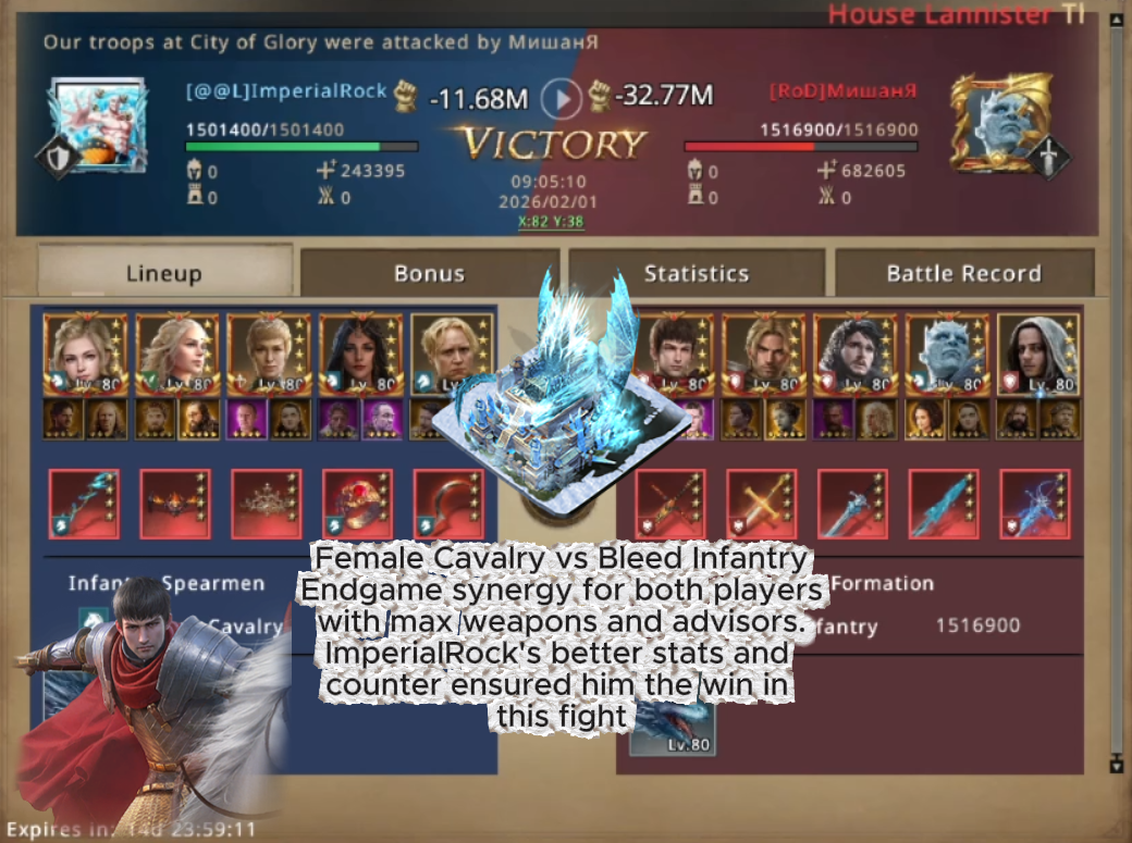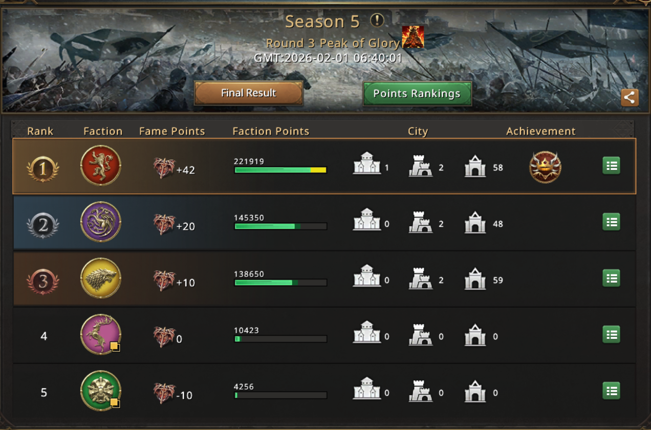 It was ImperialRock that managed to secure the city for enough time to actually receive reinforcements, and it didn't take long for the other 2 teams to swap strategy from solos to rallies. Both the Starks and Targaryen's sent their best warriors to rally, Evgen and Mikhail for House Targaryen and n1kO and Tangra for House Stark were the chosen ones and in a matter of seconds the rallies got filled and they were already on their way towards the City of Glory. As soon as they arrived in the vale and noticed how many troops there are there, the team knew it's going to be a very complicated battle. The rallies started hitting in quick succession and while none of them were winning, each of them was chipping the team's troops in the city so they always had to pull their march back and quickly speed back in. Every rally was extremely bloody for both sides but none of the houses wanted to stop and cut the loses so the millions of troops kept clashing each other, turning the snow around the city red in minutes. Despite having a few close calls with the defense army in the city dropping way too low for their comfort, the team never gave up on holding the castle and they kept healing their troops and sending them back to the city as quickly as possible. Ultimately despite having the numbers, the Starks and Targaryen's had to succumb to ImperialRock's raw strength, and the top-notch reinforcements provided by his team.