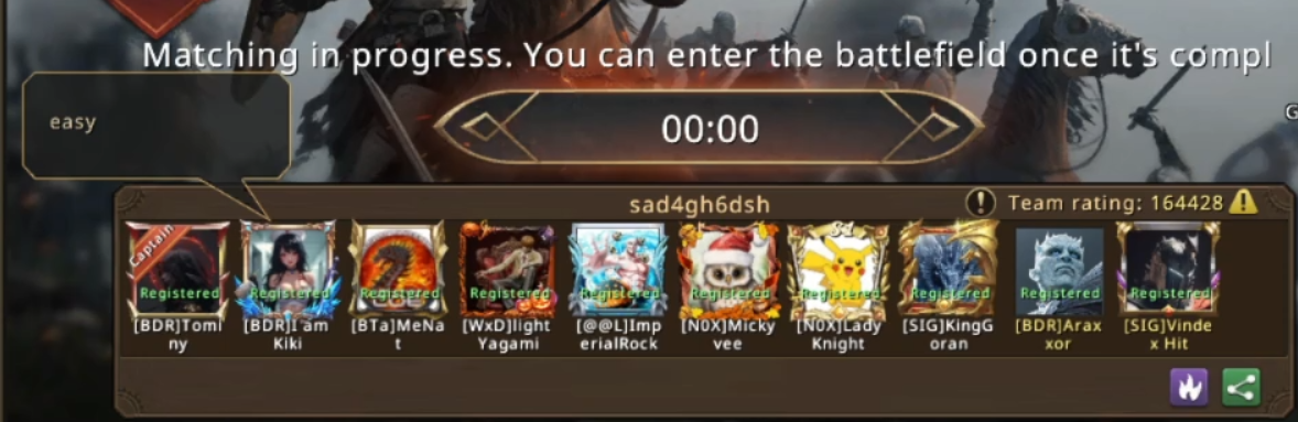 While Westeros is still dealing with a harsh winter, with snowing and cold, [N0X]LadyKnight has to prepare for yet another round of Arena of Honor. Going into the 3rd round, she's comfortable staying at 2 wins, one in solo que and one with the Fantastic10 team and now she's preparing to hopefully continue the streak. In the 2 weeks between the round, she tried her best to get stronger and while venturing into the Ruins Treasure Hunt she managed to find Sararer's weapon and now her strongest commander got even stronger. She returned from expedition on Saturday late night, just in time to get her commanders prepared and gather her troops as the Arena of Honor round was starting on Sunday, even before sunrise. As the road to the Arena of Honor battlefield was quite long, as early at 5 am she took her troops, commanders and dragons and left the [N0X] castle in a rush, fearing she might be late. Once she arrived at the battlefield and met with the rest of the team, they all got ready for the fight and Tominy registered the team for the upcoming round.