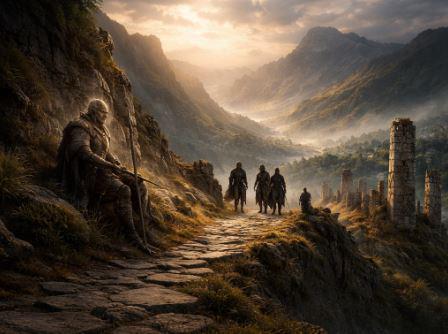 El grupo avanza al amanecer por un paisaje que deja atrás la aldea y se transforma en colinas marcadas por restos de antiguos campamentos, señales de un paso usado no para conquistar, sino para resistir. El ambiente se vuelve tenso y vigilante: Lucasta camina atento, Teodora carga el eco de decisiones recientes y Atenea y Khubilai reconocen el lugar como una frontera de voluntades. El sonido de cuernos confirma que no están solos; guardianes del paso los observan desde las alturas y, tras lanzar una lanza sin filo como advertencia, les exigen una razón para continuar.
