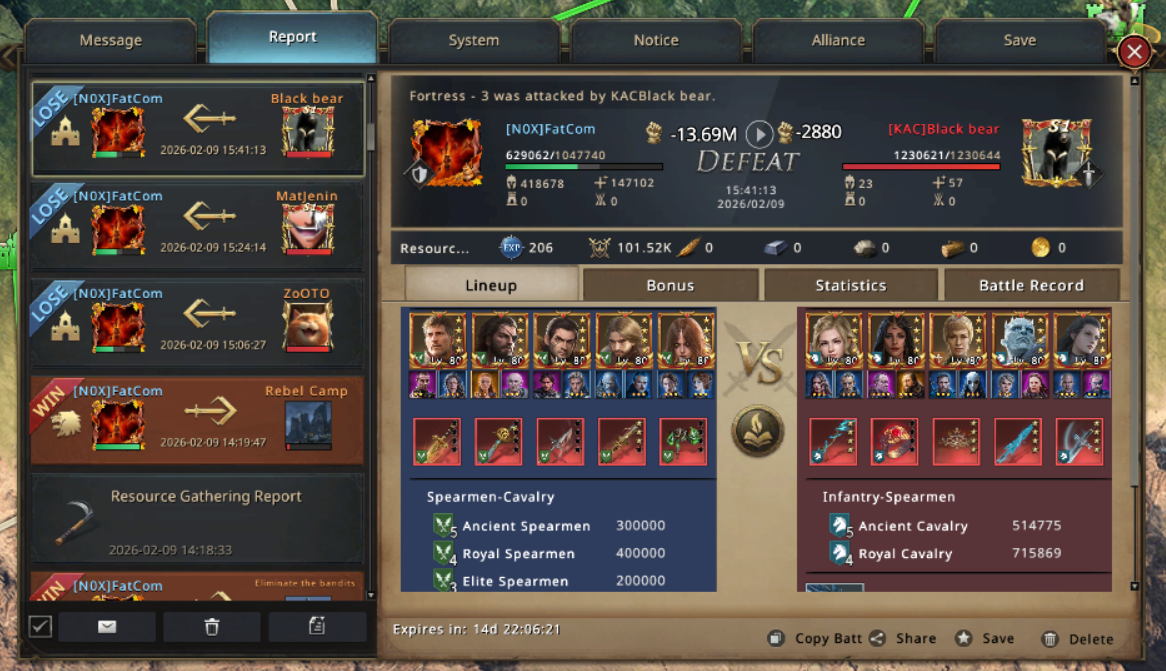 Black bear it is. I called it! But wait? I actually killed a few Cavs? Probably because I'm Spear vs Cav and they lack Brienne, and their Sapphire is only level 70. Clearly not a win for me, but not flawless defeat either.