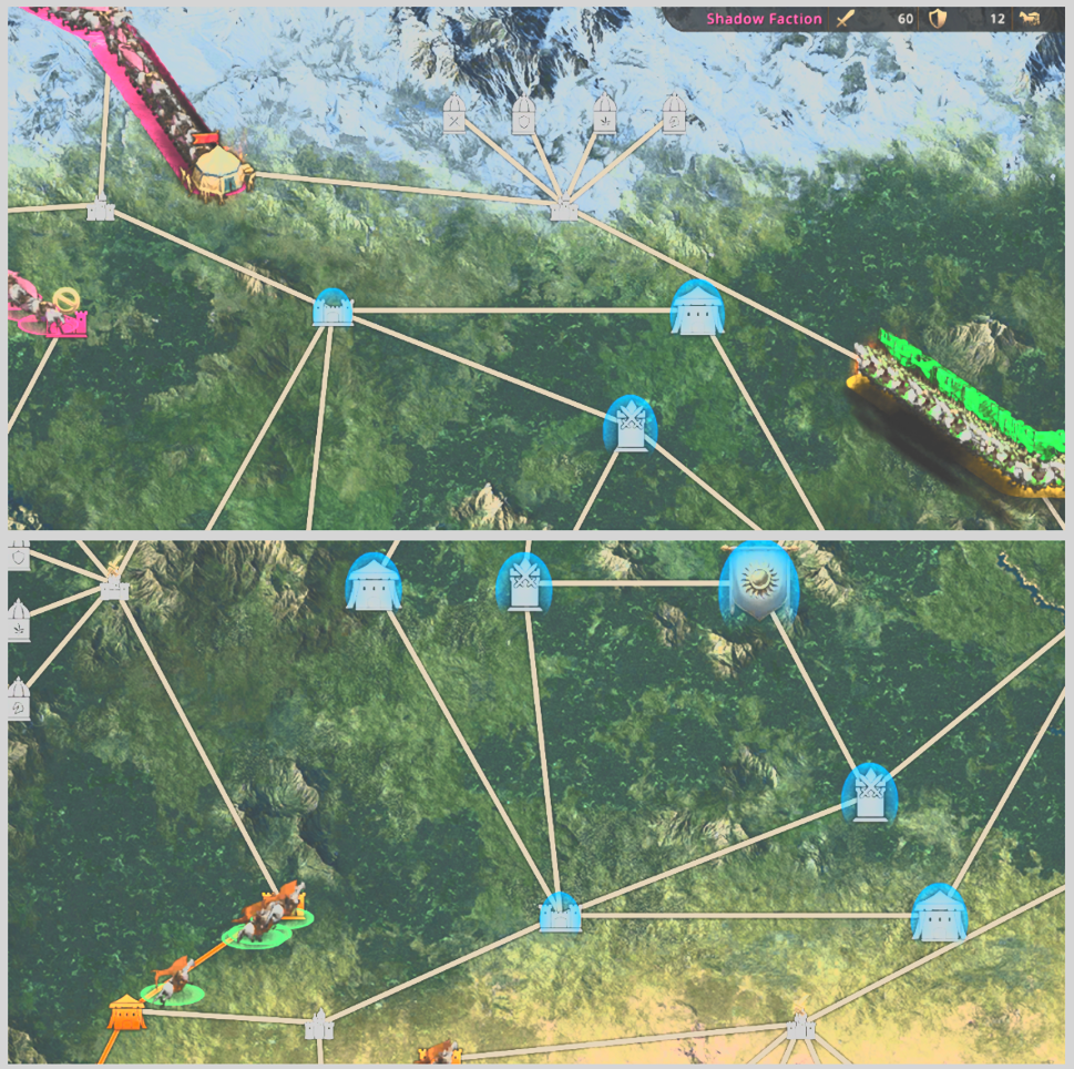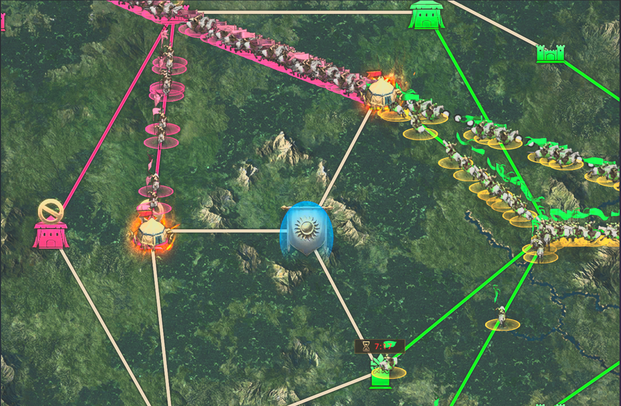 As the second day commences , we are ready to race against the other faction for one of the most crucial buildings in the map. The Fortresses, they not only grant access to the Depot Buffs but also they are used to send armies from shorter distances, which helps our main fighters to last longer in combat. As the reset strikes, the race starts. First we run to the Gates, on both sides, as we are trying to extend our presence on the map on both sides. Both other factions decide to do the same move. Now it's a battle of who manages to capture their gates faster, as that will give priority to declare on the Fortresses in between each faction's Gates.
