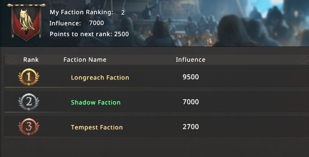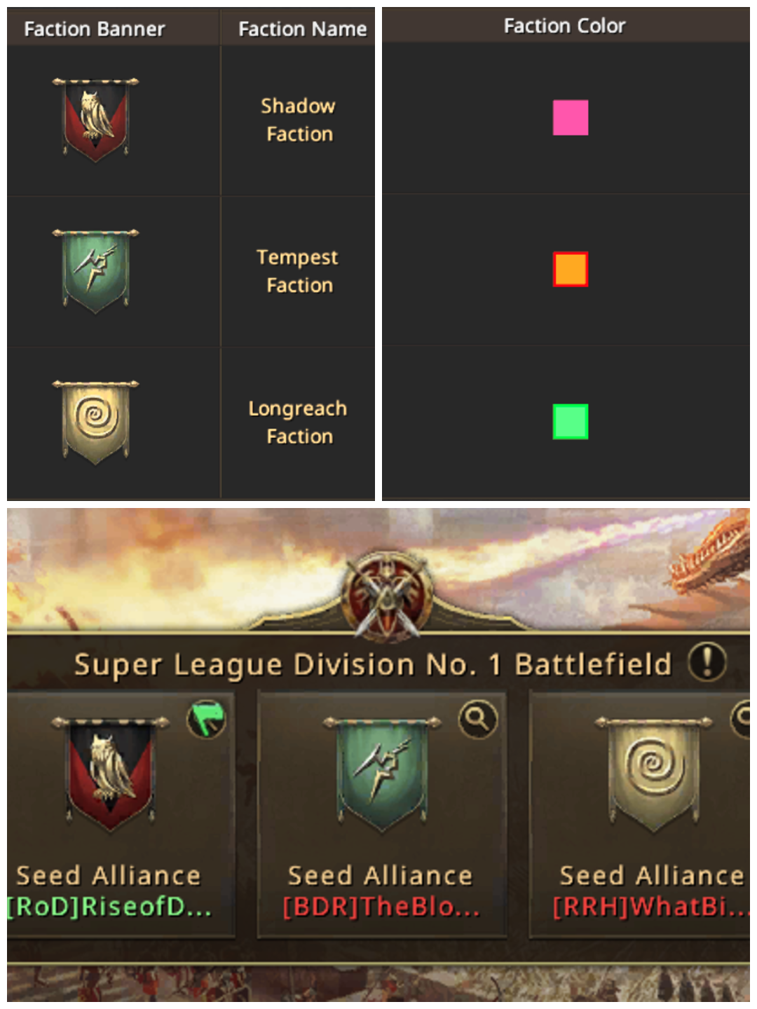 The map contains 3 factions, Shadowbane(pink), Tempest(orange) and Longhreach(green). Each faction is composed of 1 seed alliance and other smaller alliances. The goal is to capture buildings, which unlock after certain objectives have been met, and to reach the center, where Glory City lies. It is not only a battle of strength , but of speed as well, as the faster faction has priority in declaring war on buildings.The end goal of the event is to capture the Glory City and defend it until the event reaches its end.