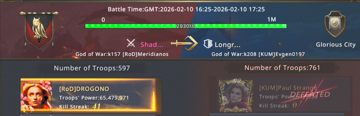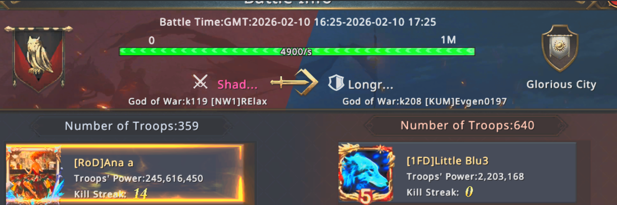 The battle begins! Our strongest deploy from the fortress, while the others send the might off all their armies from the Shadowbane Fort.Once the marches reach the Glory city, it looks like Longreach stacked a massive defence, and their reinforcements are also on the way. The whole battlefield is caught in the dance of troops, a chaotic scene.
