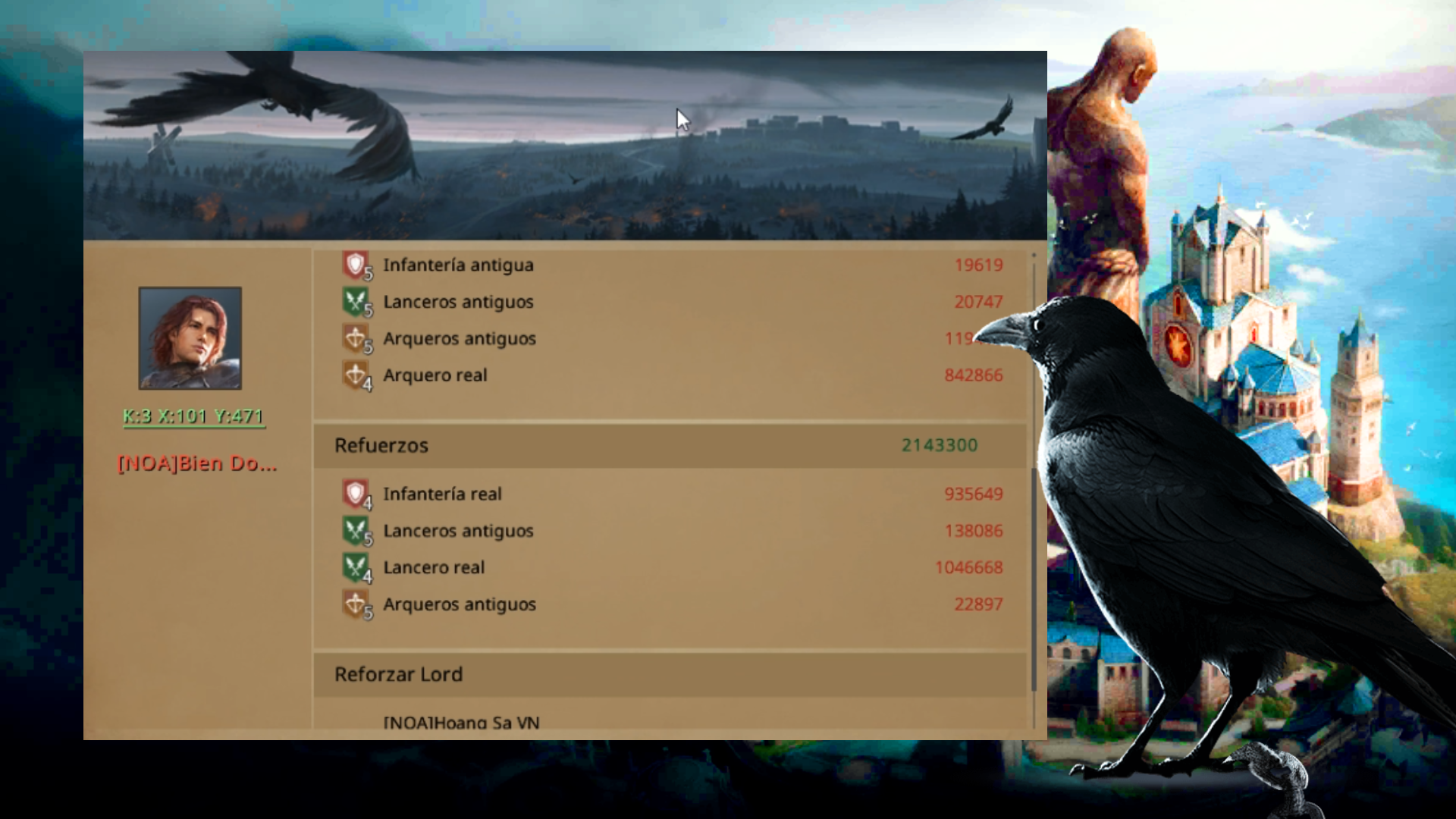 K492 faced K3, and being THE WICH the strongest in the kingdom, using the cavalry, he felt the responsibility to lead the defense and attacks to win this war. Although at the beginning there were no major offensives by either side, as they mainly limited themselves to gathering tasks. And his kingdom was taking the lead for the moment thanks to the farmers, so he went to rest. The hours passed and everything seemed normal, but suddenly the enemy kingdom began to increase its points. In addition, there was an attack on one of the members of the kingdom's alliance. He had neglected the fight for those hours, but when he encountered this situation, he called his friend Boca, who uses infantry as his main line of attack. Both checked the elimination rank and there weren't many points, so they concluded that these were generated by occupying the Great Cities. They sent a scout, and in Casterly Rock and King's Landing they had troops, both were with lords, the other occupation was in Riverrun.