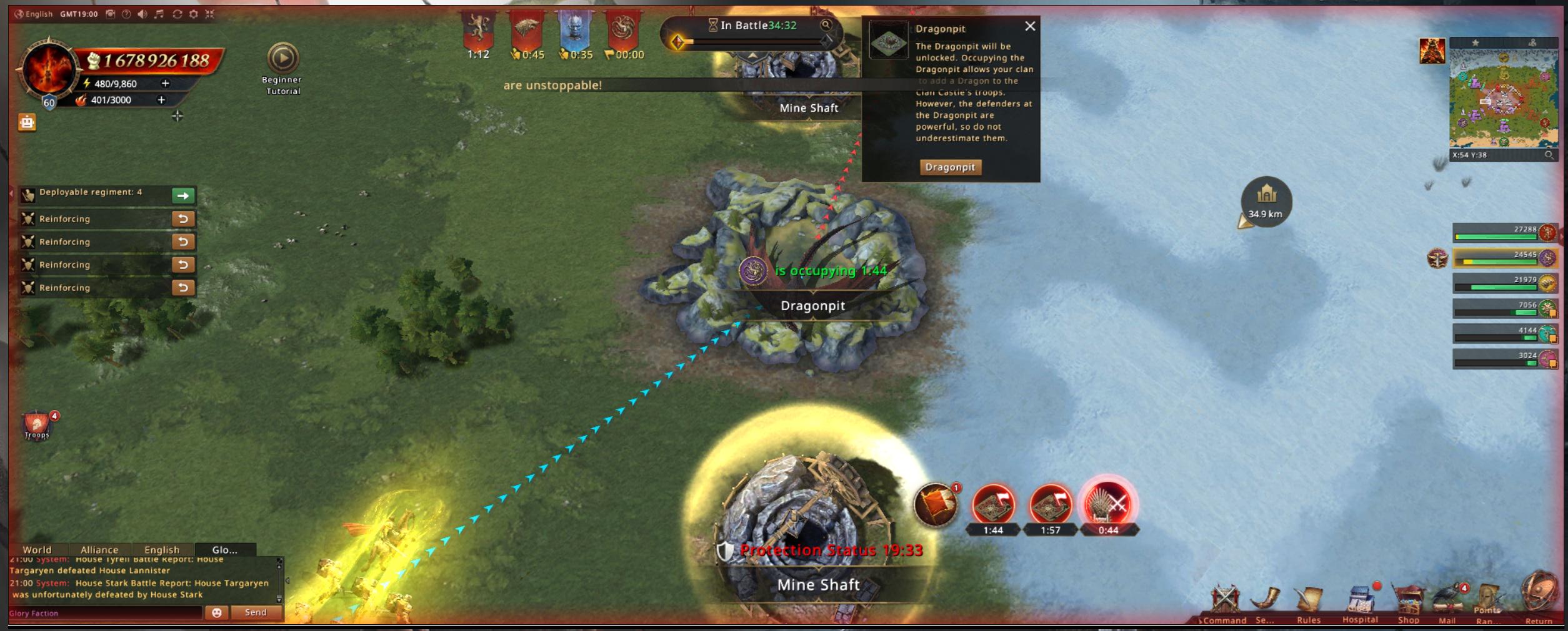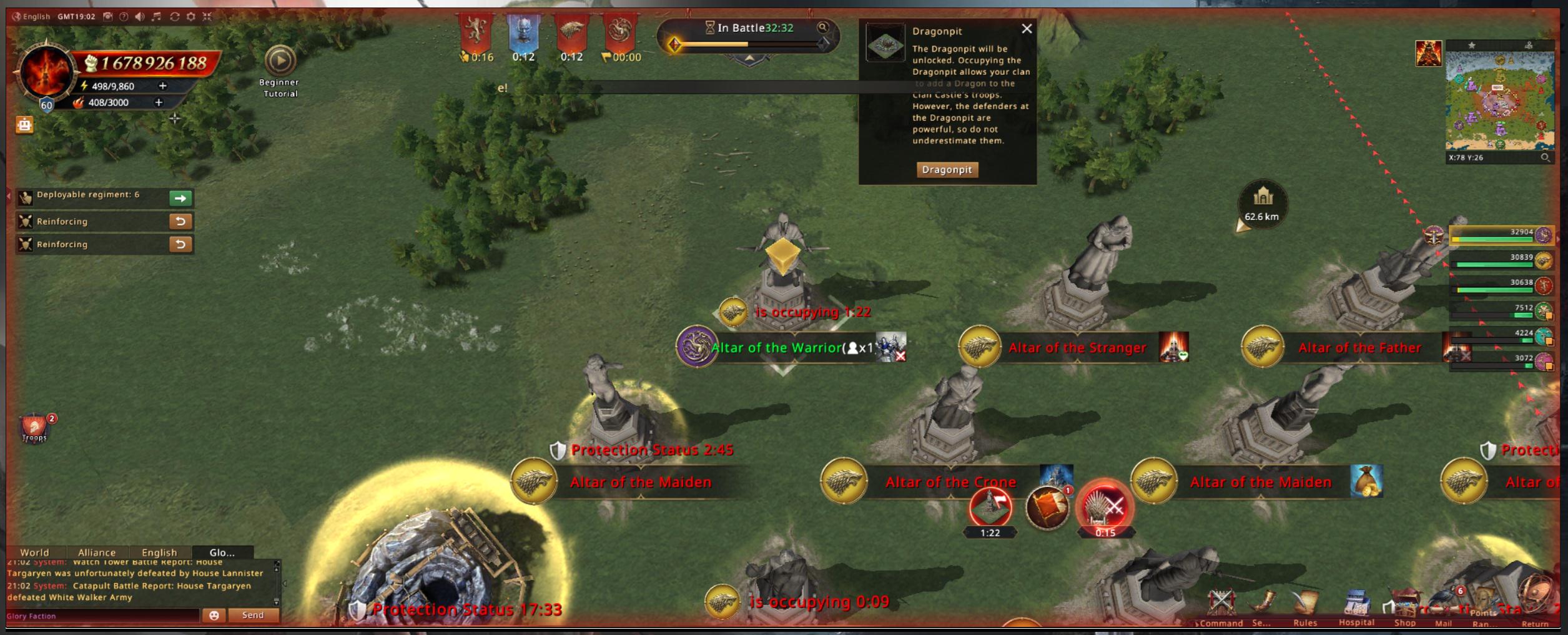 Mid game slows down a bit. Dragonpits open. With our Troop Camp strategy, those buffs matter. We push for two out of three.