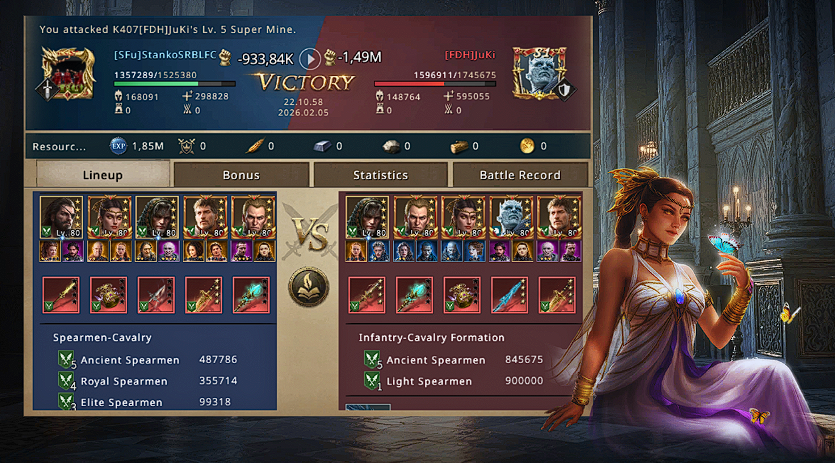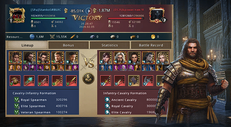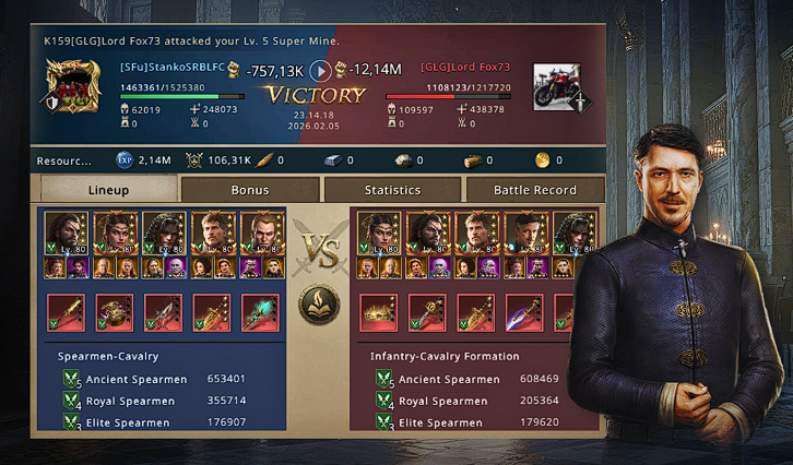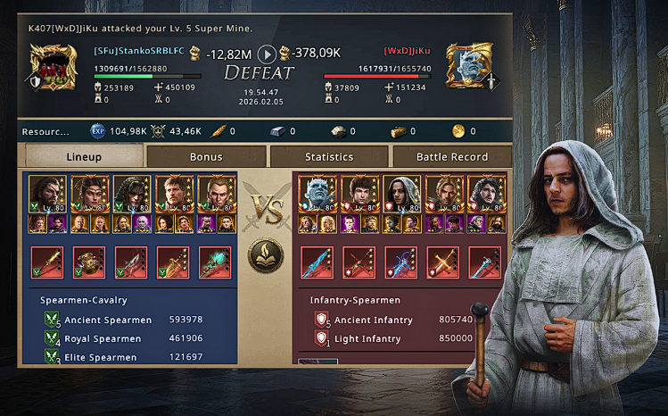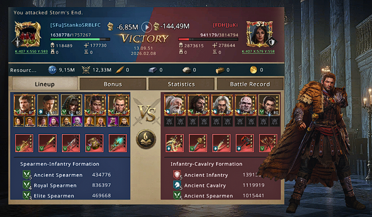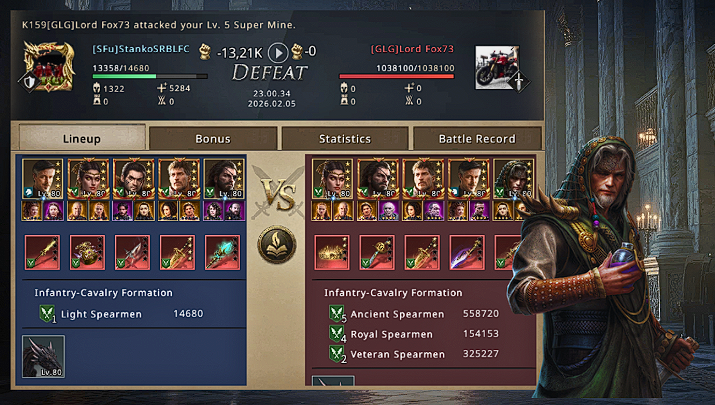 Time passed, there was no update, but there were no strong attacks either. I was slowly climbing toward second place. I was only a few minutes away when an attack happened. It was a strong spearman. I was stronger, but he had an NK with a 4-star weapon, and that made a big difference. He was losing much less troops than I was.