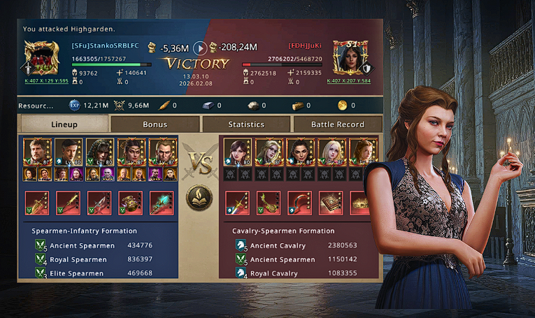 The old warrior spite woke up inside me. I analyzed the situation carefully and realized I could attack two of them because they had no synergy and no lord in the castle. The only problem was that they had almost 5 million troops each. It was a very risky move, but I saw a chance to get revenge for the mines. I prepared my strongest troops. This had to be very fast. He couldn't notice me at all; this was my chance, and I wasn't going to miss it. I will attack Highgarden first. Three times more opponents, but I was stronger.