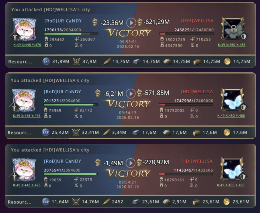 On the next day, on the kingdom where all started – k49 and where were two HD! Players, something happened. HD! Wellisa started attack on a farm, a move which was spotted immediately, she got in fervor and waited there, probably she wanted to provoke someone to attack her? The war horns echoed in RoD, fast message was sent the blockade dragon was used they had 15 min to plan the attack. If she wanted to trap someone, a strong warrior was needed, someone who could stand on counter attack. And then one of the strongest warriors, the nightmare of the Seven Kingdoms – UR Candy heard the horns and was ready for the revenge. Always in war gear, very well experienced in the fights, and most important, without any mercy to enemies, he jumped on k49.