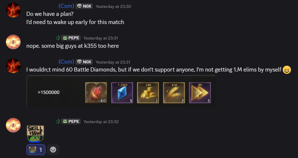 But the reality of this match is simple. No one was accepting unknown accounts into their main alliances. If I wanted eliminations today, RoD shell it was.