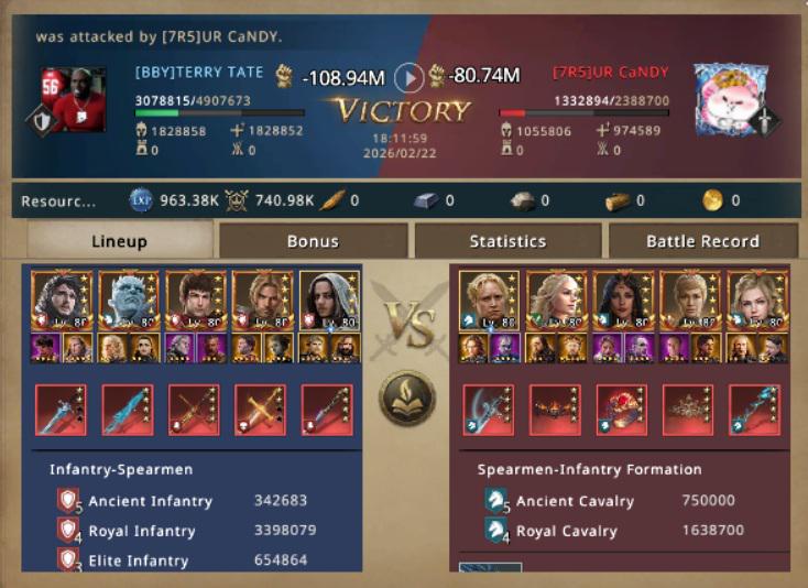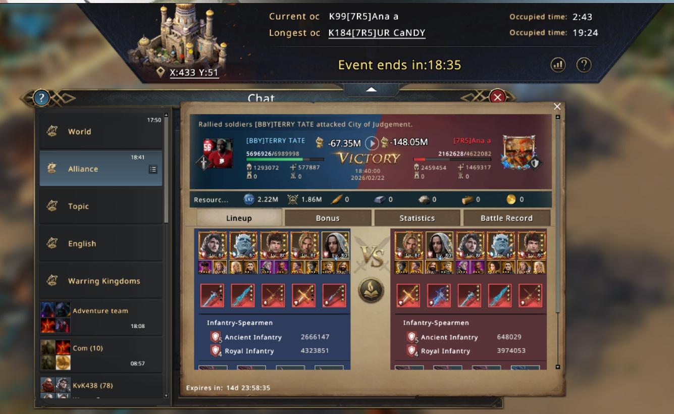 Unfortunately for them, Candy cannot solo TERRY!😅But 7R5’s starts more rallies on us. Their siege is far more consistent than ours was. It's clear they have more people on the map and more leads.