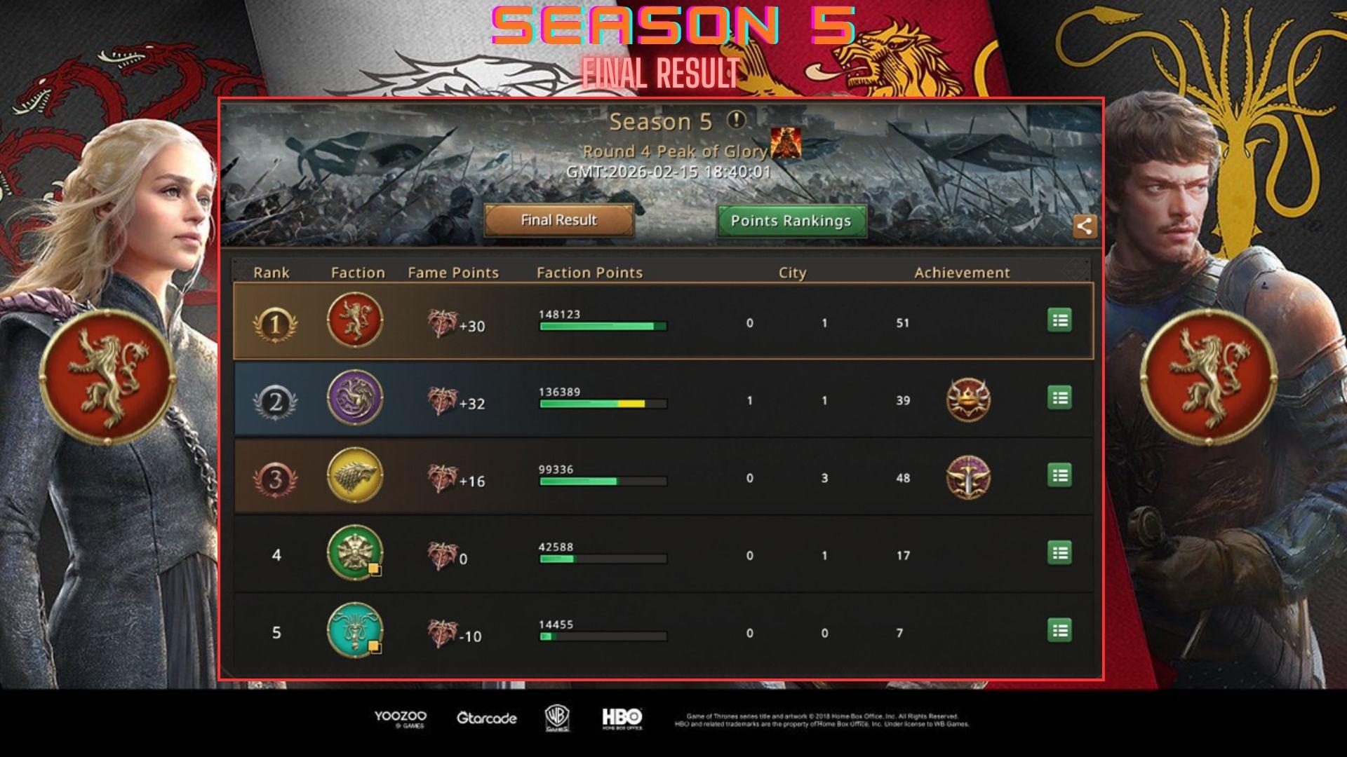 The final minute ticked away and House Lannister celebrated a hard-fought win, “this strategy works, I no longer need to rely on the Glory City but things did fall into place for us,” Moshow2 acknowledged the stars aligned for his team but it’s possible to replicate this strategy in the future. “We were 12k points ahead in the end, the Mineshafts were the key,” Tyenne Saand also celebrated his first win of the season but the Glory King rank was far from obtained.