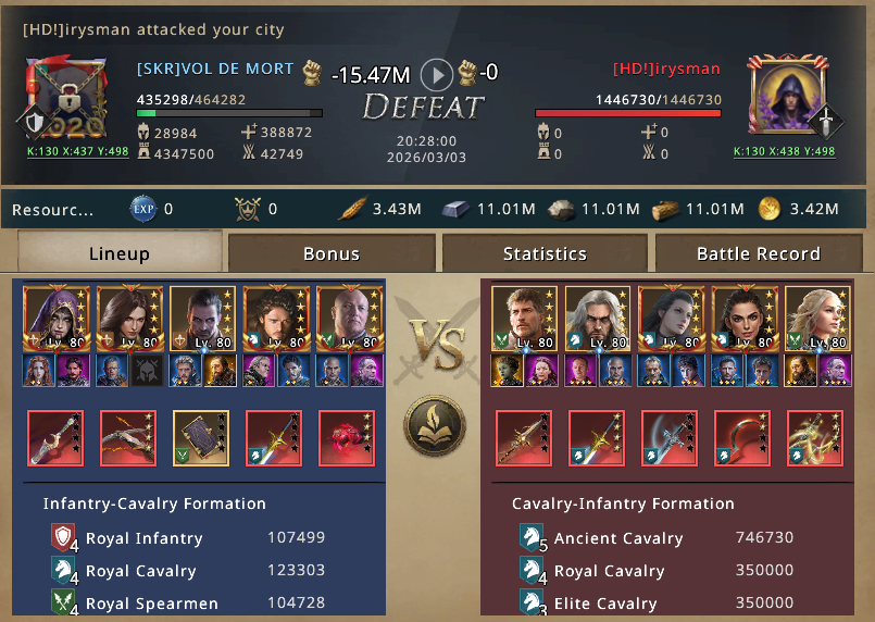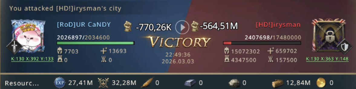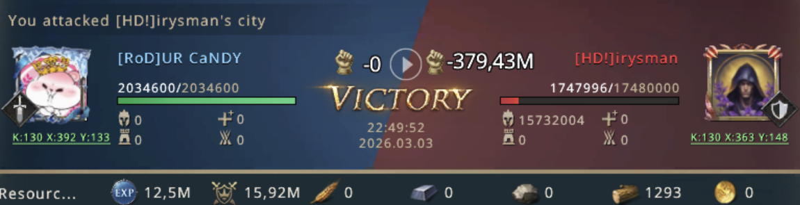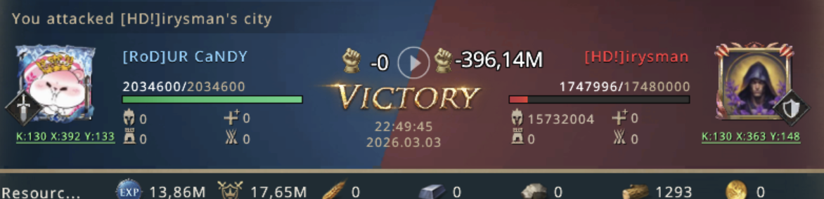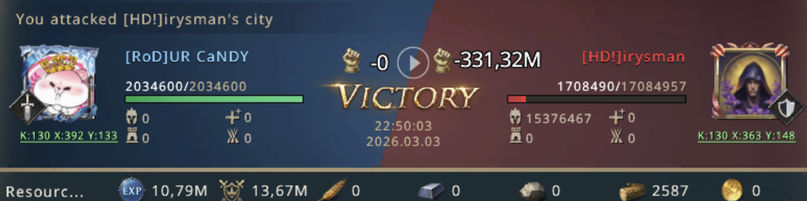 irysman had realised what was happening at this point in time, but it was too late, all of his high tier troops were already gone, and now, an attack from UrCandy was marching once more towards his ablaze castle. The result of the third attack was identical to the second one, and all because it was only tier 3 troops left within irysman's castle, he had little t5 and t4. This was the reason why the attack felt off for UrCandy, his opponent did not have many troops that could injure him.