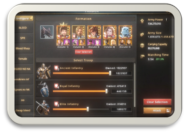 Lory took her best commanders and assembled a powerful army, receiving a 75% buff, and now had 1.6 million soldiers ready to march. She decided to use Rhea instead of Jon, trying to imitate the formations of other powerful players. Even though she knew in her heart it was only a pale imitation.