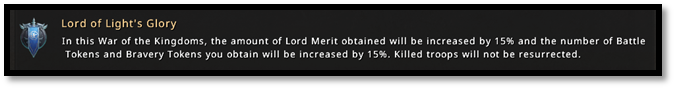 The conflict had been going on for hours, and was destined to see the defeat of the server Lory was on. During the night, many had fought and fallen. So many troops burned, resources, speed ups. But there was no way to win. But this KvK was special, Lord of Light's Glory. The rewards were considerable, merit and tokens increased. She couldn't help but try something.
