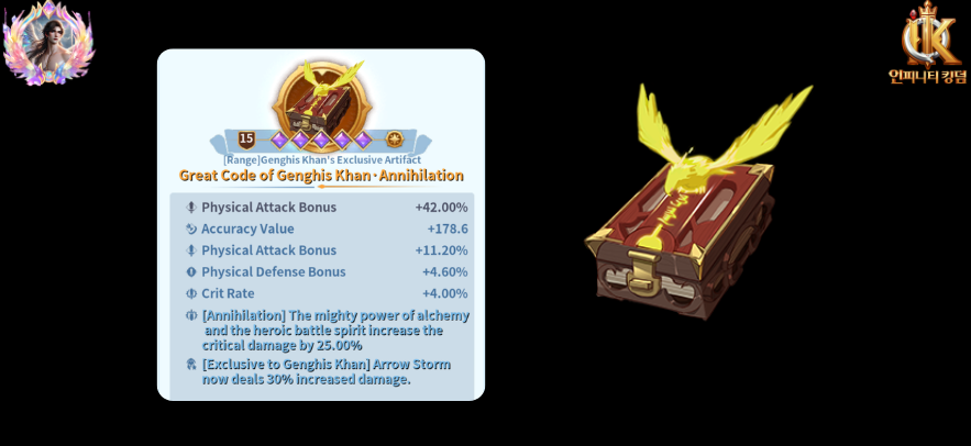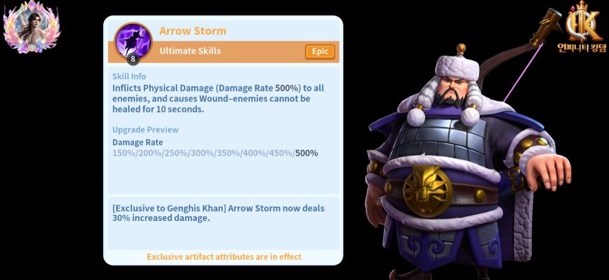 Khan’s artifact increases Arrowstorm’s total damage by 30%. There is no mechanic change. No extra effect. Just amplification. Because nearly all his impact is concentrated in one ultimate, a flat 30% modifier is more meaningful on him than on multi-trigger immortals.
