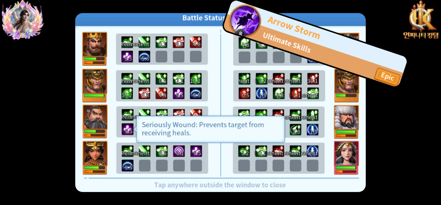 Arrowstorm hits every enemy on the field.At max level, it reaches 500% Physical scaling. That alone makes it one of the strongest full-field burst ultimates among Epic immortals. But damage is only half the story. Every cast applies Serious Wound for 10 seconds. That blocks all forms of healing: