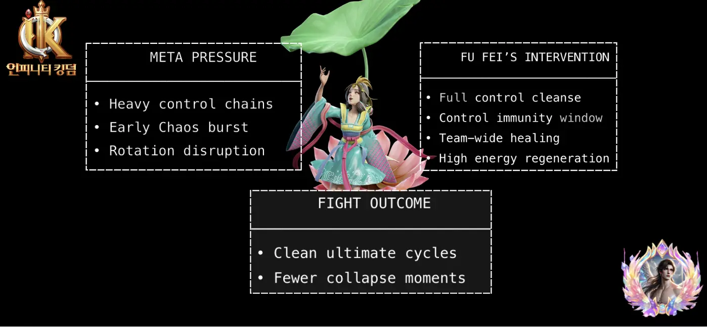 If Khan gets stunned before casting, his entire pressure window disappears. Fu Fei prevents that scenario.