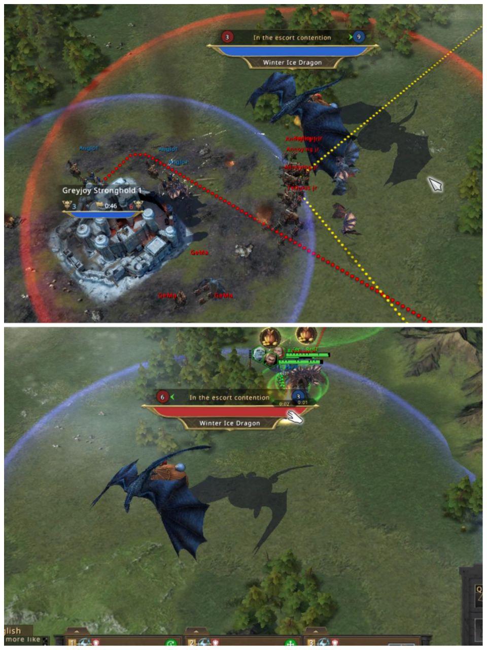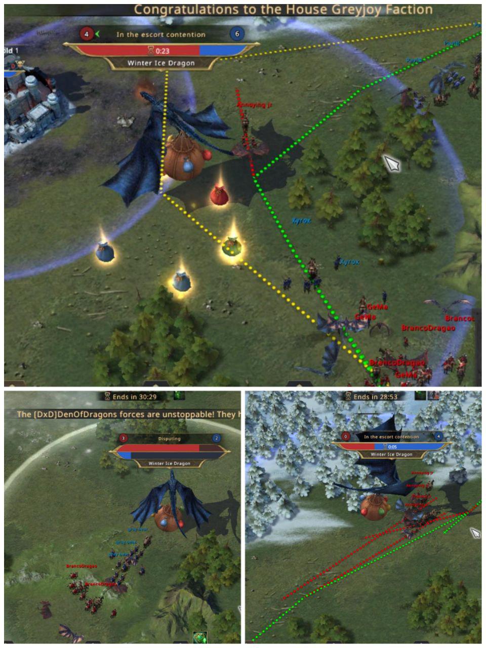 The dragons are about to appear and DxD have already sent troops in the name of Annoying Jr and Tedious Jr (I swear I’m not making those names up) fighting PavlB who was already waiting for the Winter Ice dragon. Sadly for QGD, there were more DxD troops and the dragon went towards their camp though it has to cross the entire map. When the dragon arrived at Greyjoy stronghold 1, GeMa of DxD started fighting for the stronghold and also added their troops to the escort’s count, making it even more difficult for QGD as they were already struggling with the dragon, now they are also struggling with the buildings. On the other hand, DxD were able to successfully escort the flaming sun dragon to their base and get the points but while that is happening the efforts of Igris Red2 and PavlB pay off as the Winter Ice dragon turns around and starts going to QGD’s base now !!!